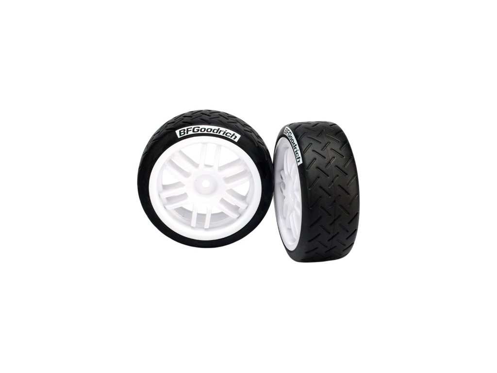 Kompletní univerzální kola pro RC auta Traxxas Rally 1:16. Bílý disk s nalepenými pneumatikami BFGoodrich® Rally.