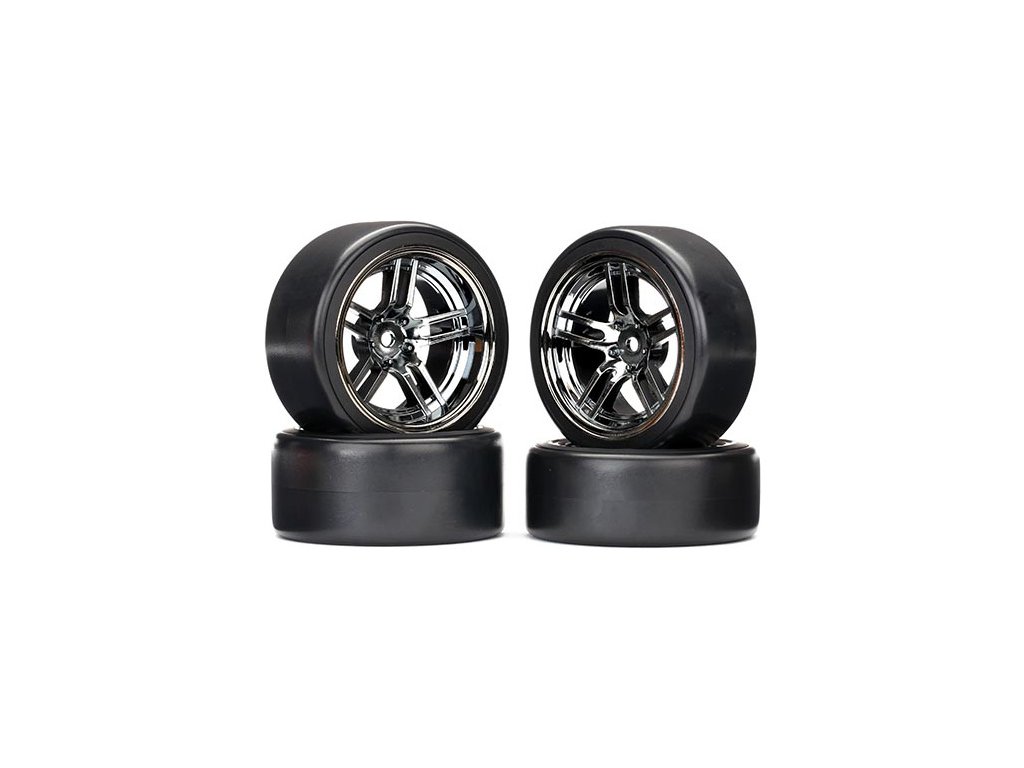Kompletní přední i zadní kola pro RC modely auta Traxxas 4-Tec 2.0. Disky Split-spoke Černý chrom s pneumatikami Drift (v balení 2ks přední+2ks zadní).