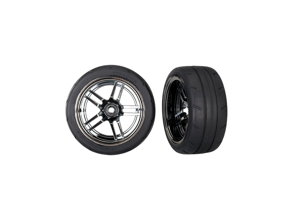 Kompletní zadní kola pro RC modely auta Traxxas 4-Tec 2.0. Disky Split-spoke Černý chrom s pneumatikami Response (2 ks v balení).