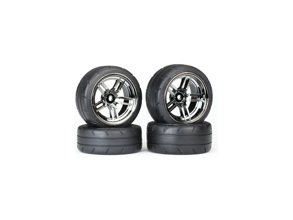 Kompletní přední kola pro RC modely auta Traxxas 4-Tec 2.0. Disky Split-spoke Černý chrom s pneumatikami Response (2 ks v balení).