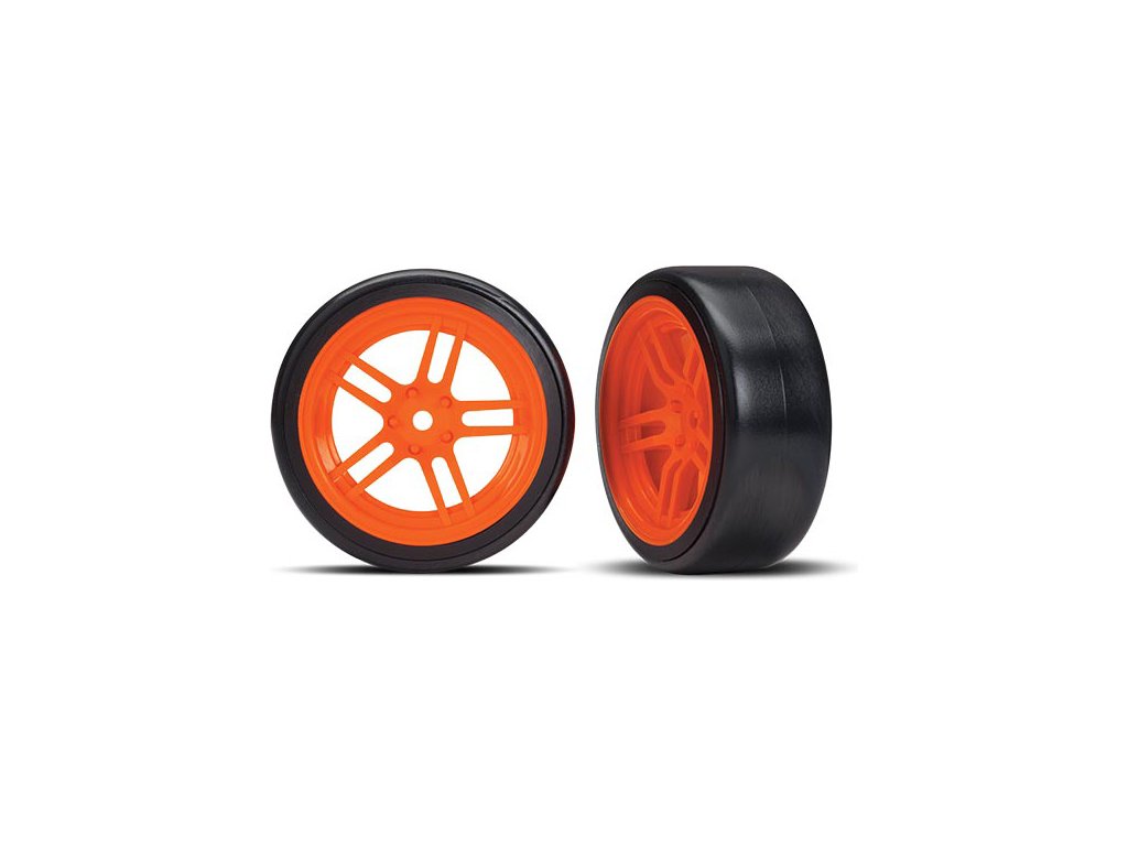 Kompletní přední kola pro RC modely auta Traxxas 4-Tec 2.0. Oranžové disky Split-spoke s pneumatikami Drift (2 ks v balení).