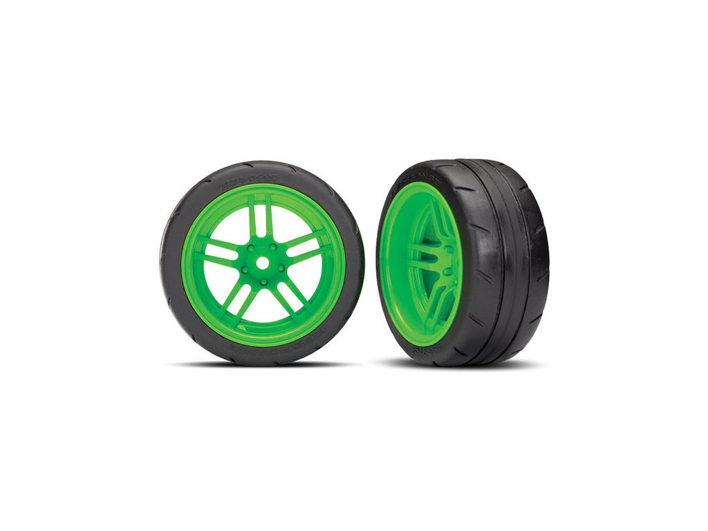 Kompletní zadní kola pro RC modely auta Traxxas 4-Tec 2.0. zelené disky Split-spoke s pneumatikami Response (2 ks v balení).