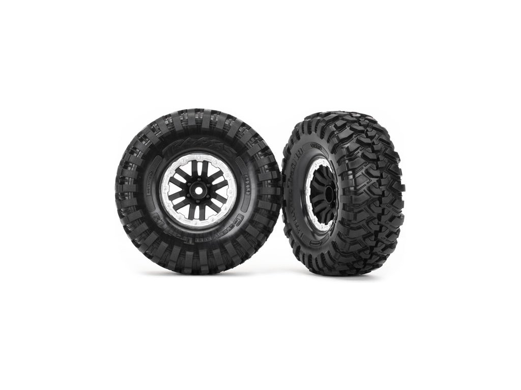 Kompletní univerzální kola pro RC modely aut TRX-4. Černé Disky TRX-4 Sport se stříbrnými ráfky a pneumatikami Canyon Trail (2 ks v balení).