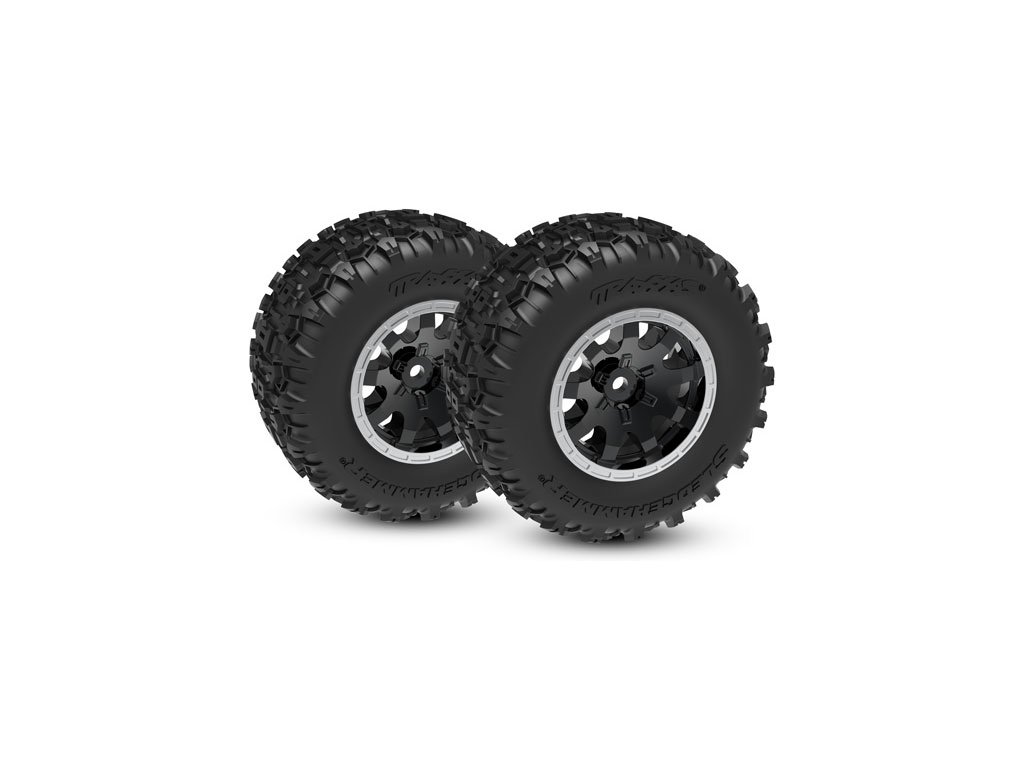Kompletní přední kola pro RC auto Traxxas Mini Maxx. Disk černý saténový s pneumatikami Sledgehammer s pěnovou vložkou. Průměr disku 2.1" (vnější) /2.6" (vnitřní).