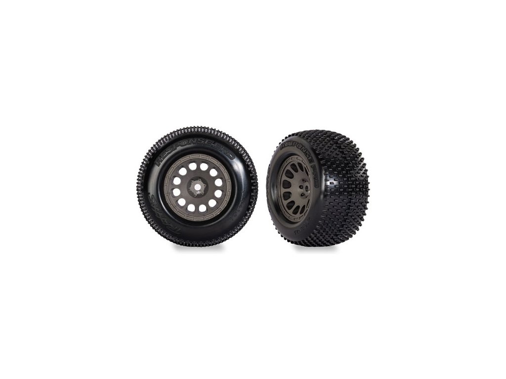 Kompletní kola pro RC auto Traxxas Mini XRT. Disk uhlově šedý s pneumatikami Response Pro (měkká směs S1) s pěnovou vložkou. Průměr disku 2.1" (vnější) /2.6" (vnitřní).
