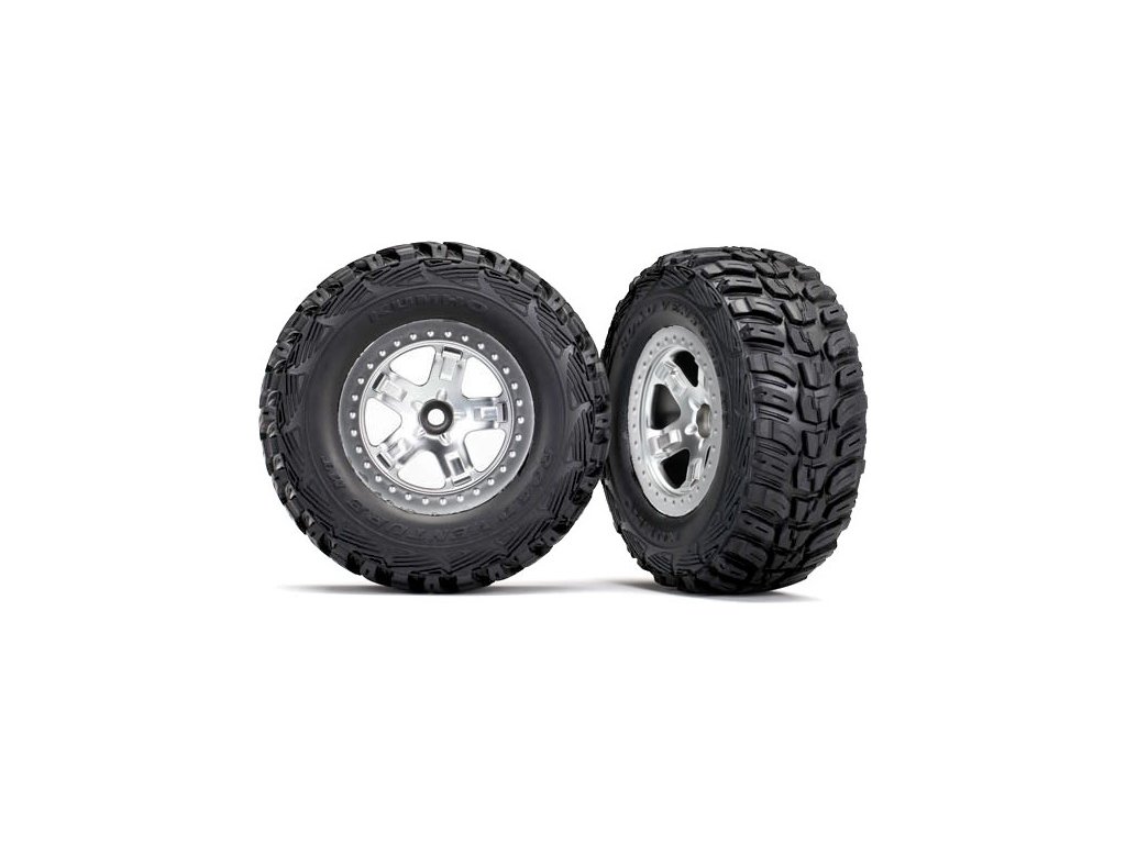 Kompletní přední kola pro 2WD auta Traxxas Slash. Saténové disky Bead Lock s nalepenými pneumatikami Kumho (měkká směs) a vložkou.