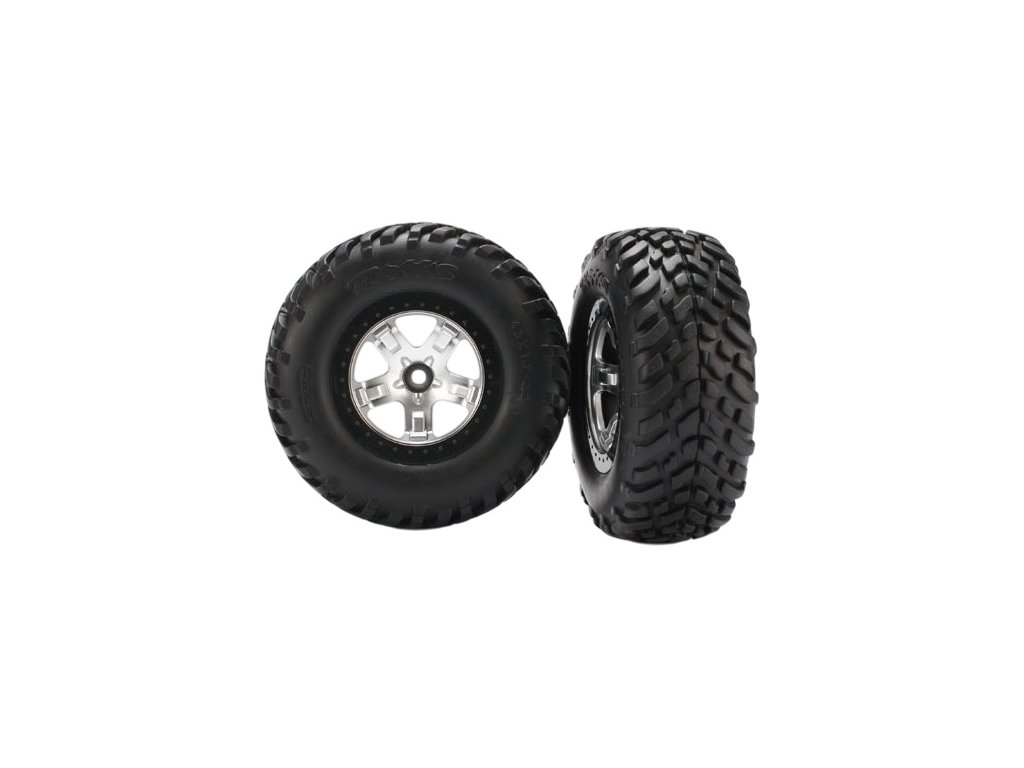 Kompletní přední kola pro 2WD auta Traxxas Slash. Stříbrné disky s černými ráfky a nalepenými pneumatikami Off-Road s vložkou. Rozměr disku 61/81x42 mm.