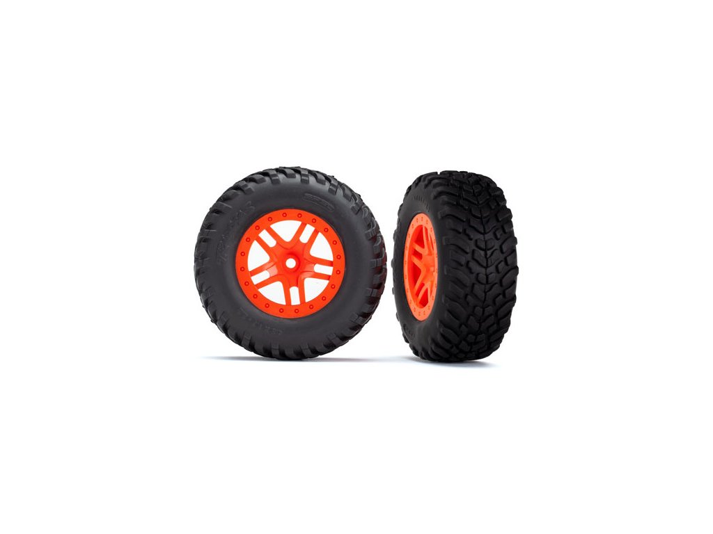 Kompletní zadní kola pro 2WD, přední i zadní pro 4WD auta Traxxas Slash. Oranžové disky SCT Split-Spoke s nalepenými pneumatikami SCT.
