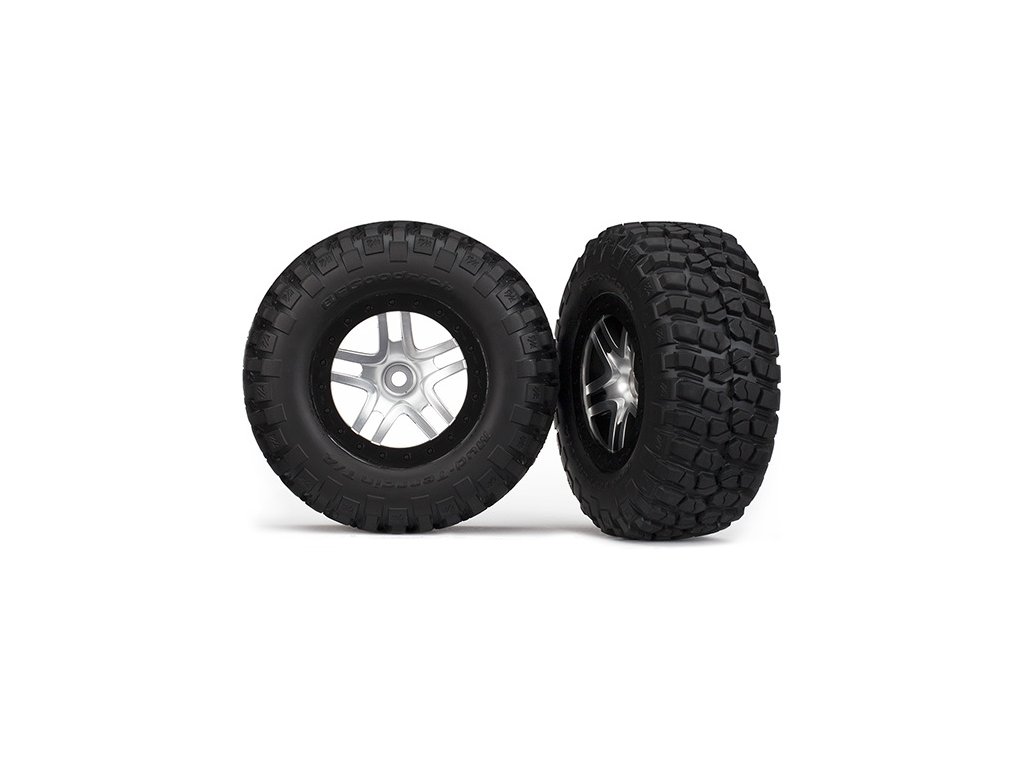 Kompletní přední kola pro 2WD auta Traxxas Slash. Stříbrné disky s černými ráfky a nalepenými pneumatikami BFGoodrich® KM2 s vložkou. Rozměr disku 61/81x42 mm. Celkový rozměr 110x46 mm. Unašeč je šestihran 12mm s offsetem 22 mm.