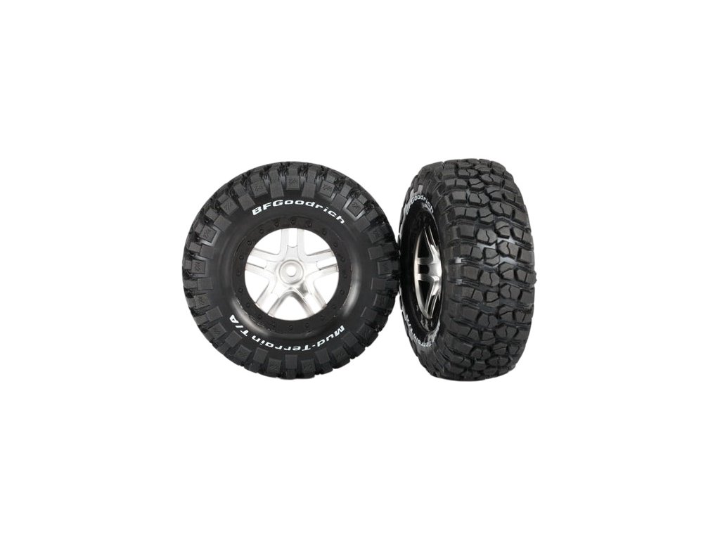 Kompletní zadní kola pro 2WD, přední i zadní pro 4WD RC auta Traxxas. Stříbrný disk Split-Spoke s černými ráfky s pneumatikami BFGoodrich KM2 Mud Terrain (S1 super měkká směs) s vložkou.