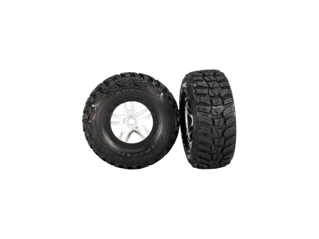 Kompletní univerzální kola pro RC auto Traxxas Slayer. Saténové disky s černými ráfky Bed Lock s nalepenými pneumatikami Kumho z ultra měkké směsi (S1) a vložkou. Rozměr disku 61/81x42 mm. Celkový rozměr 110x46 mm. Unašeč je šestihran 12mm s offsetem 30 mm.
