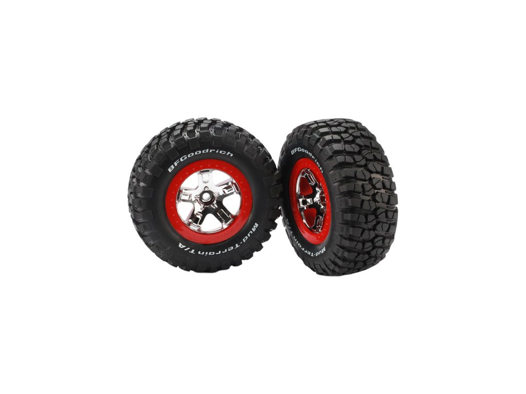 Kompletní přední kola pro 2WD auta Traxxas Slash. Chromované disky s červenými ráfky a nalepenými pneumatikami BFGoodrich® s vložkou