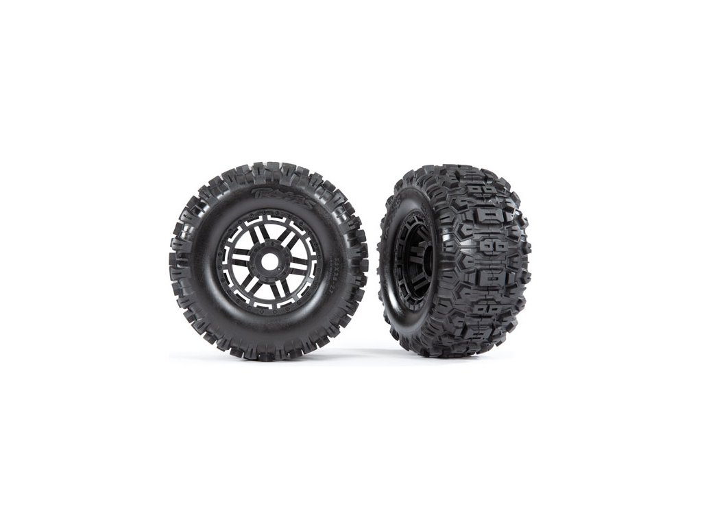 Traxxas kolo 2.8/3.6", black wheels, Sledgehammer tires (2) - Pneumatiky poskytují extrémní trakci a kontrolu nad modelem v různých off-roadových terénech. Nalepené pneumatiky s pěnovou vložkou na discích. Unášeč 17 mm.