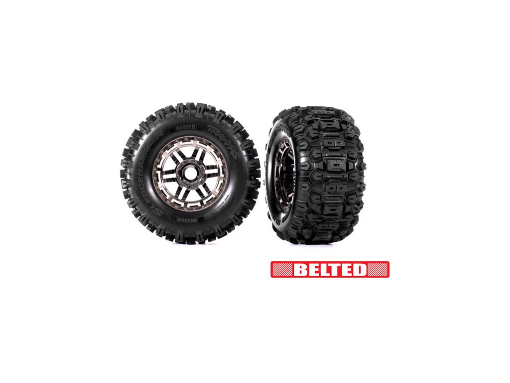 Traxxas kolo 2.9/3.8", disk černý chrom, pneu Sledgehammer All-Terrain belted. Široký dezén s otevřeným blokem se nezanáší špínou ani úlomky, vysoká trakce v terénu. Integrovaný vnitřní pás snižuje vyboulení při vysokých rychlostech. Unašeč 17 mm. 2 kusy.