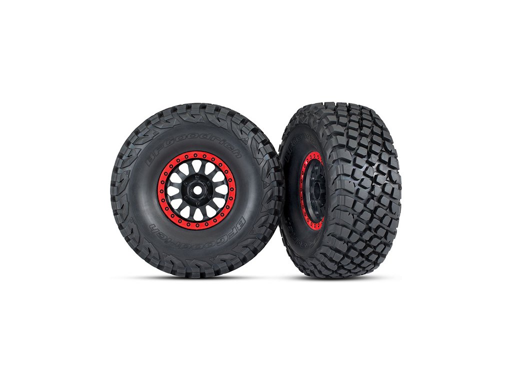 Kompletní univerzální kola pro Traxxas Unlimited Desert Racer. Disky Method Racing v černém provedení s červenými ráfky a pneumatikami Baja KR3 (2 ks v balení).