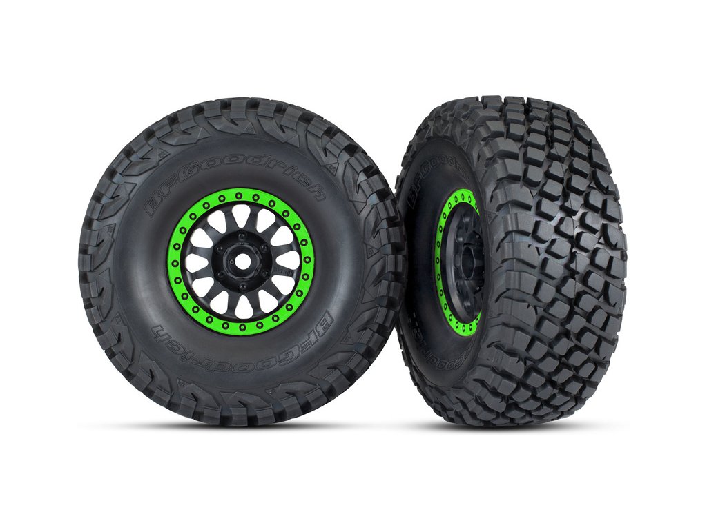 Kompletní univerzální kola pro Traxxas Unlimited Desert Racer. Disky Method Racing v černém provedení s zelenými ráfky a pneumatikami Baja KR3 (2 ks v balení).