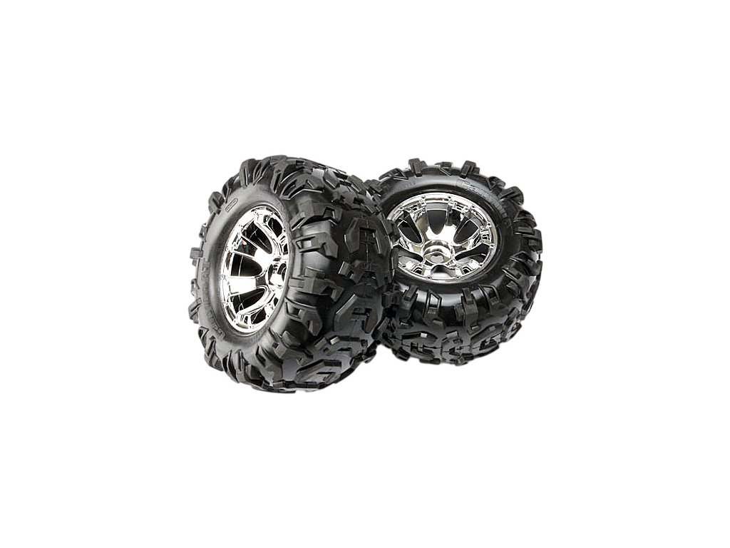 Kompletní kola pro RC auta. Chromované disky Geode s nalepenými pneumatikami Canyon AT a vložkou. Rozměr disku 97x70 mm. Celkový rozměr 180x95 mm Unašeč je šestihran 17 mm s drážkami a offsetem 35 mm.