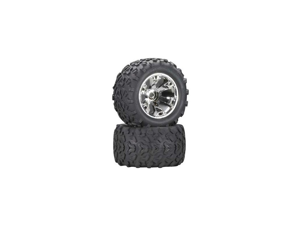 Kompletní přední kola pro RC auta 2 WD. Chromované disky Geode s nalepenými pneumatikami Canyon a vložkou.
