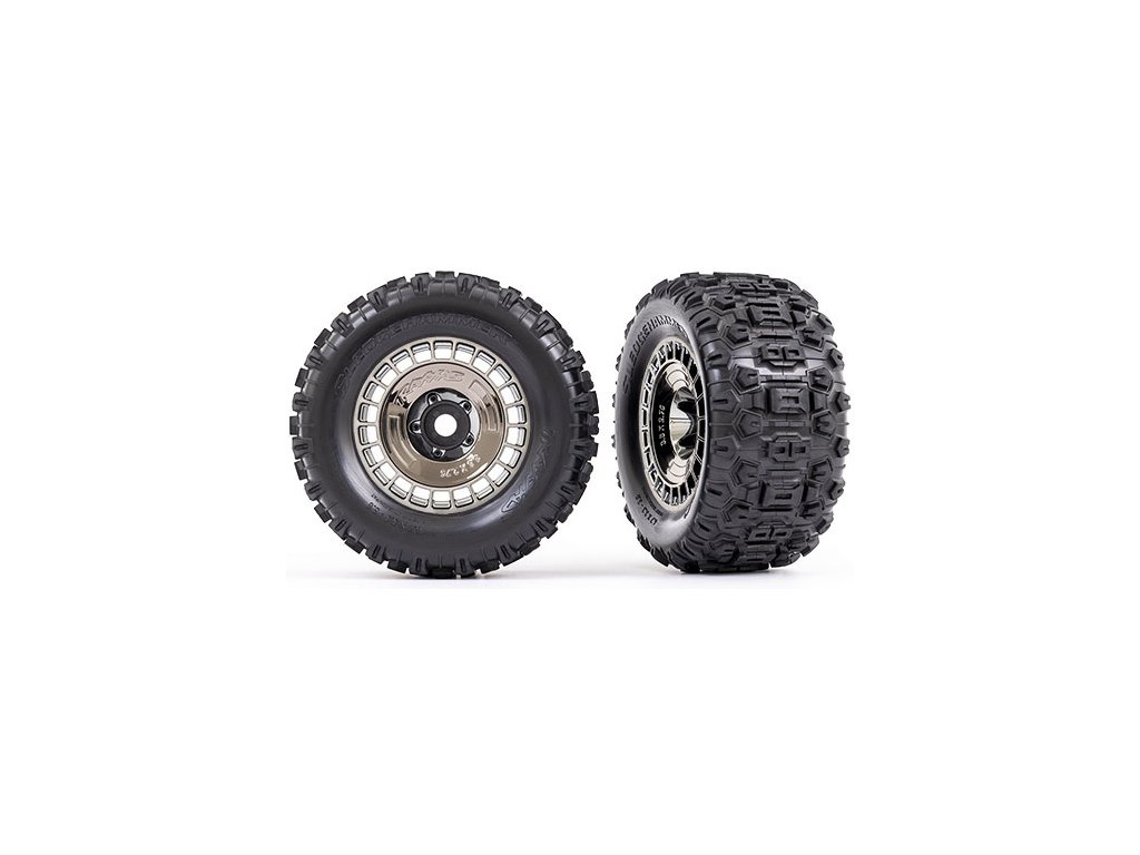 Traxxas kolo 3.8", pneu Sledgehammer, disk černě chromovaný s výměnnou poklicí. 2 ks. Pneumatiky, díky inspiraci motokrosem, poskytují extrémní trakci a kontrolu nad modelem. Možnost různého offsetu s volitelnou sadou #9567. Unašeč 17 mm šestihran - drážkovaný.