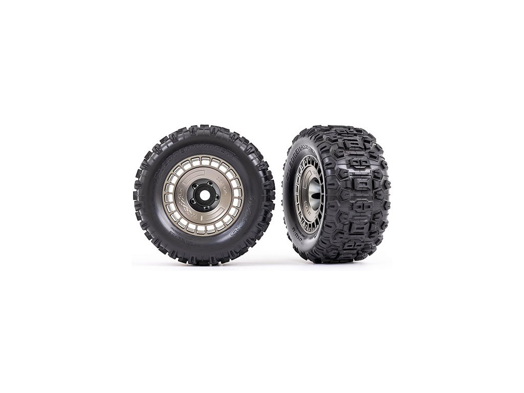 Traxxas kolo 3.8", pneu Sledgehammer, disk polomatný černě chromovaný s výměnnou poklicí. 2 ks. Pneumatiky, díky inspiraci motokrosem, poskytují extrémní trakci a kontrolu nad modelem. Možnost různého offsetu s volitelnou sadou #9567. Unašeč 17 mm šestihran - drážkovaný.
