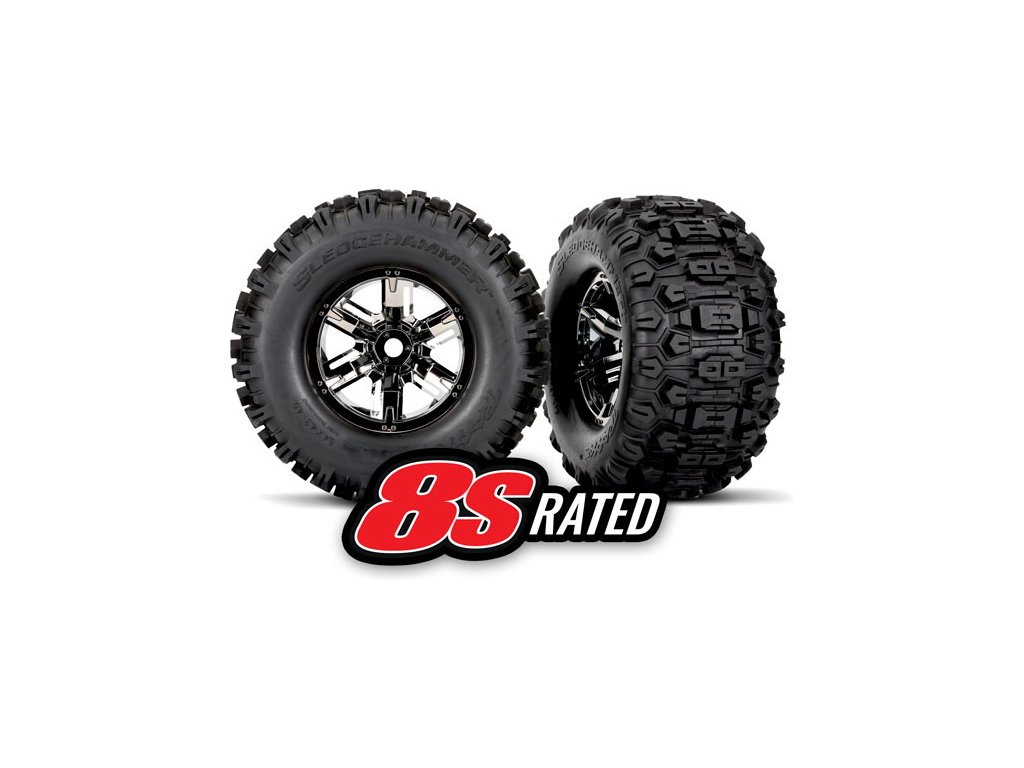 Pneumatiky poskytují extrémní trakci a kontrolu nad modelem v různých off-roadových terénech. Větší průměr pneumatik zároveň poskytuje vyšší světlou výšku pro lepší průchodnost terénem. Dezén běhounu Sledgehammer s otevřeným blokem poskytuje výbornou trakci a zároveň odvádí bláto z pneumatik. Nalepené pneumatiky s pěnovou vložkou na discích. Unašeč 24 mm.