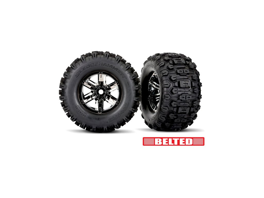 Náhradní díl pro RC modely aut Traxxas X-Maxx, X-Maxx® Ultimate a XRT: kolo 4.3/5.7", disk X-Maxx černý chrom, pneu Sledgehammer (pár). Pneumatiky jsou vybaveny lehkým pásem v kostře, který zabraňuje vyboulení při vysokých rychlostech.