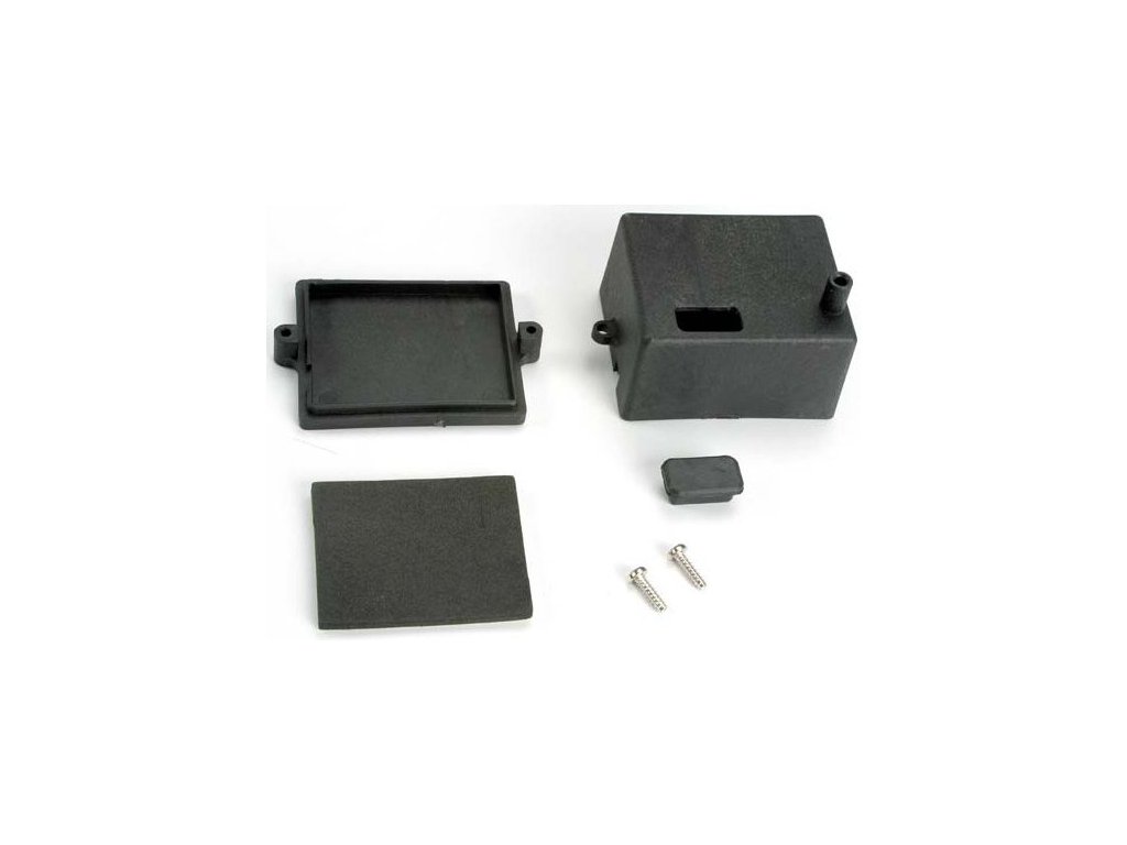 Náhradní díl pro RC modely aut Traxxas: krabička přijímače, příslušenství s pryžovou zátkou a lepicí pěnovou podložkou.
