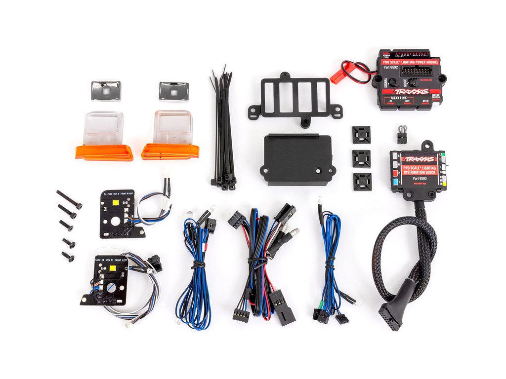 Balení obsahuje Pro Scale napájecí řídící modul LED, rozvodný modul LED, držák modulu, kabely senzoru motoru, propojovací kabel s přijímačem, propojovací Maxx kabel s přijímačem TQi, montážní příslušenství, komponenty LED osvětlení z instalační sady a LED světelné sady. Návod CZ a manuál EN, DE, FR, SP.