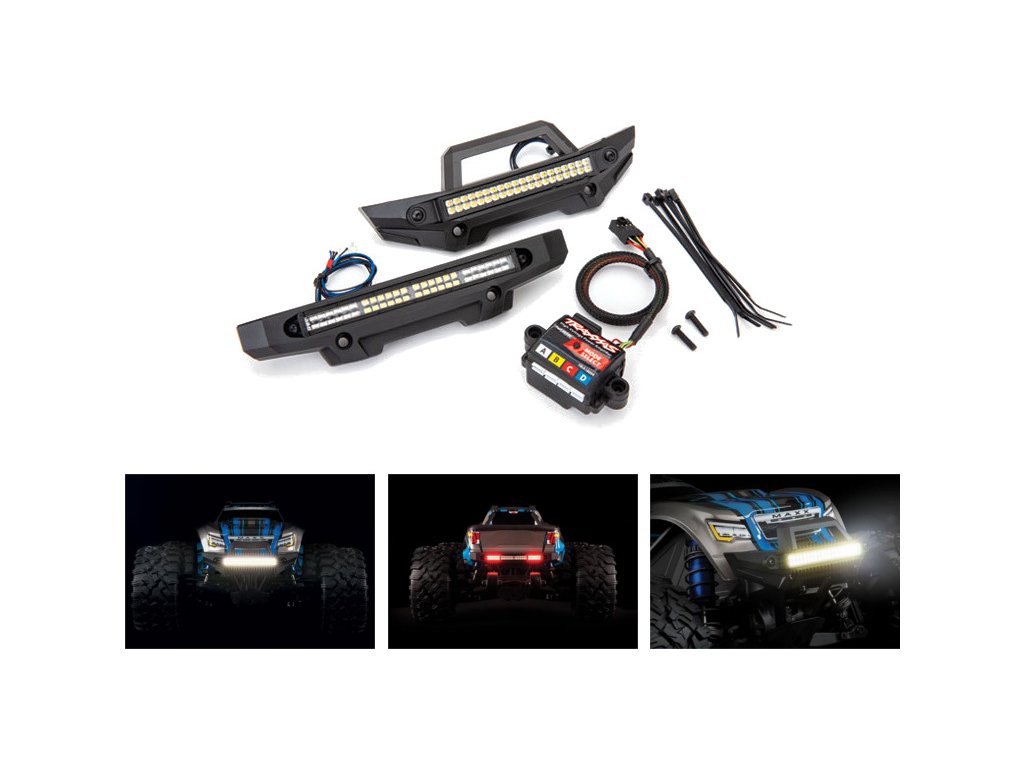 Traxxas kompletní LED osvětlení pro RC model auta Traxxas 1:8 Maxx. Posuňte tento brutální, hbitý model na novou úroveň a užijte si dech beroucí jízdu ve dne i v noci. Přední LED lišta v nárazníku bezpečně nasvítí cestu před Vámi, zatím co zadní brzdová lišta dodá modelu šmrnc. Funkční brzdová světla se spínají skutečně jen při brzdění a ne při zpátečce. Jednoduše připojte jednotlivé světelné lišty do napájecí řídící jednotky a tu do regulátoru. Vše je jednoduché, intuitivní a voděodolné*.