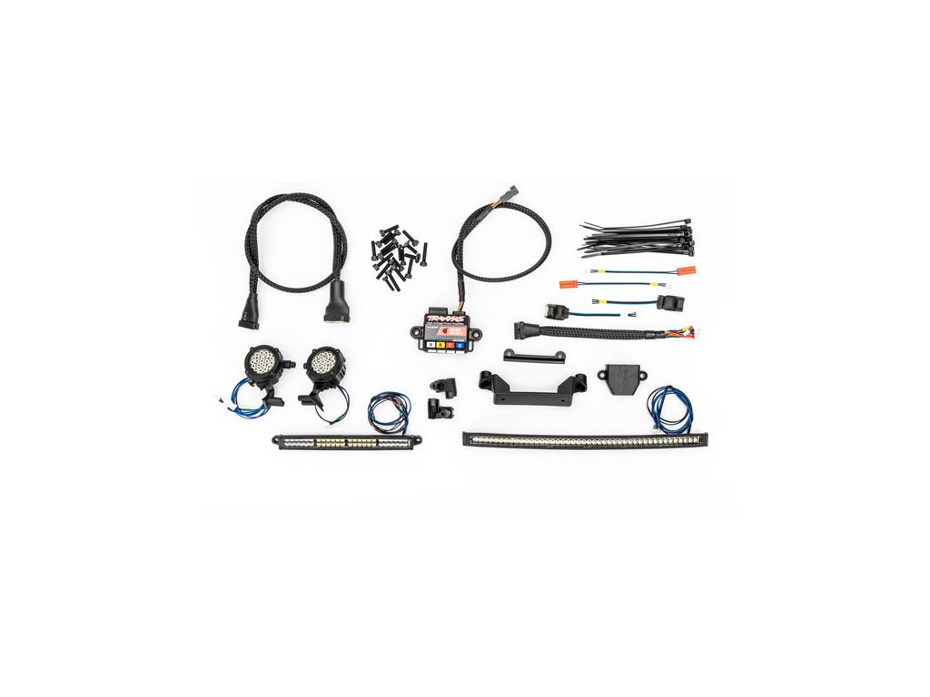 Traxxas sada LED osvětlení kompletní pro RC model auta Funco. Přední světelná LED lišta, zadní multifunkční LED lišta, boční LED reflektory a napájecí modul pro připojení k regulátoru VXL-8S, montážní příslušenství. Inteligentní ovládání umožňuje nastavení světel přes aplikaci Traxxas Link.