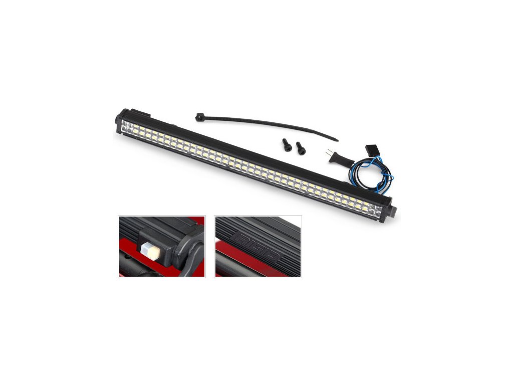 Střešní LED osvětlení pro RC model auta Traxxas TRX-4 Land Rover Defender 1:10. Střešní LED osvětlení se jednoduše nainstaluje na ochranný střešní rám. Jedinou úpravou by vytvoření malého otvoru v karosérii pro provlečení kabelů. Na liště je malý přepínač, kterým si můžete zvolit intenzitu svícení LED. Toto střešní LED osvětlení můžete rovněž nainstalovat i na jiné modely, upevnění ke karosérii je velmi snadné. K provozu potřebujete mít nainstalovaný Traxxas napájecí zdroj LED osvětlení (není součástí balení).