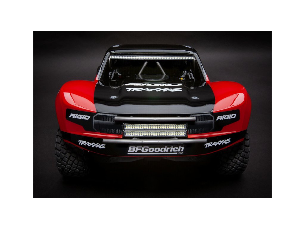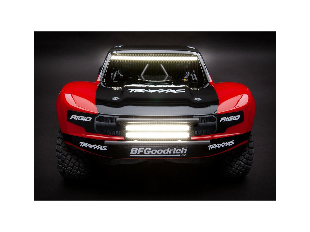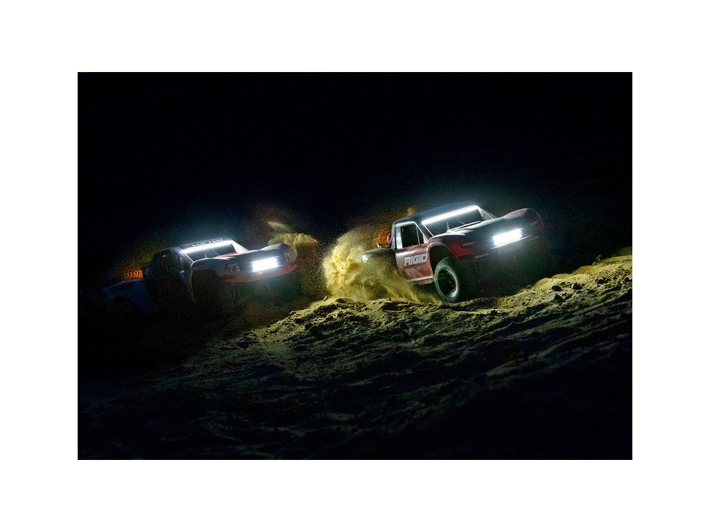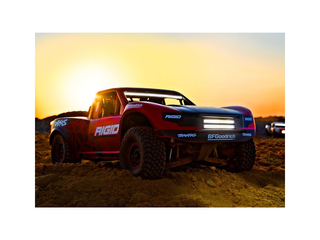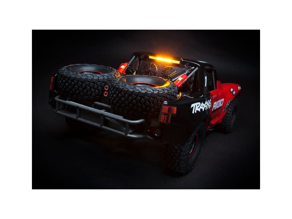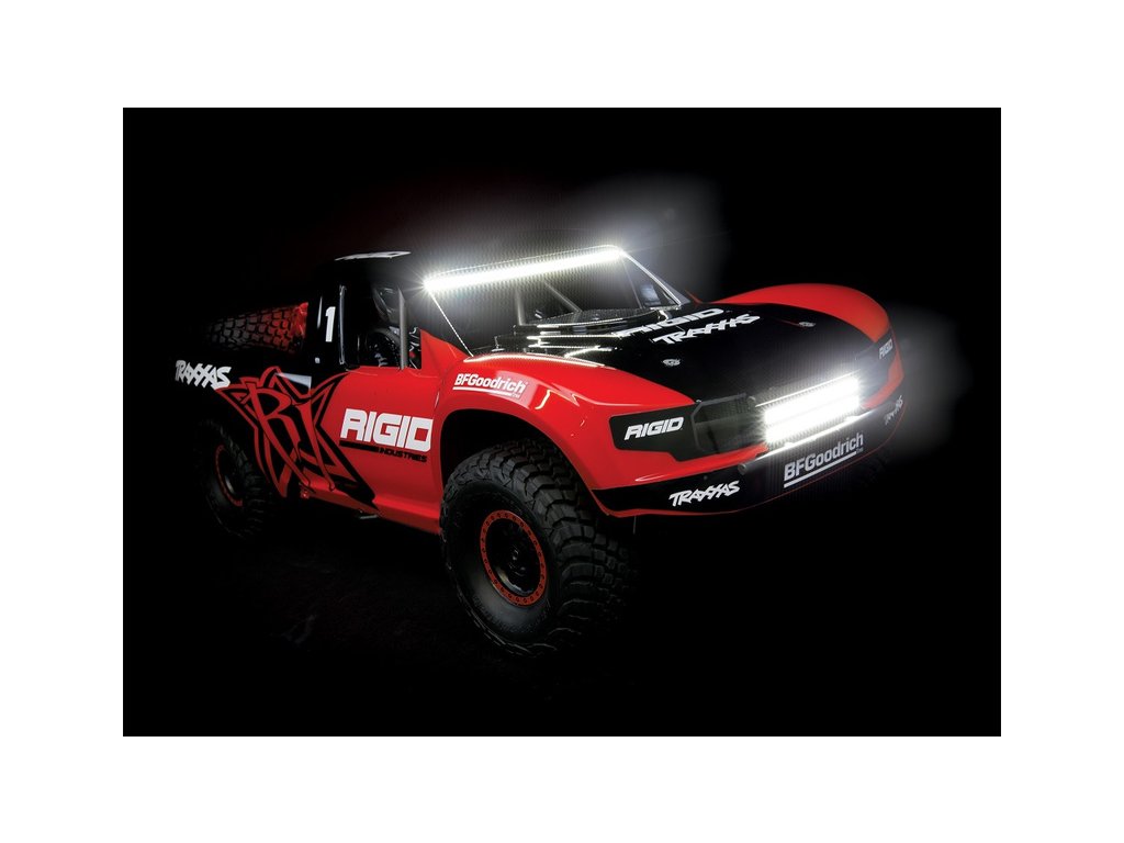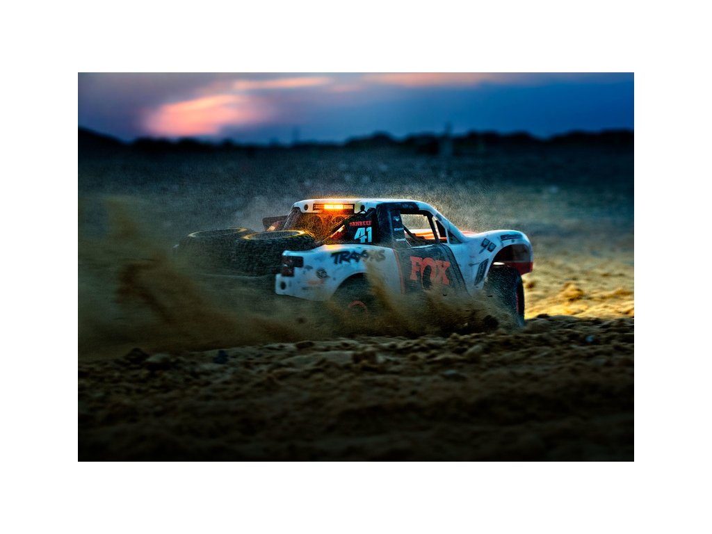 Jedinečná světelná sada změní Unlimited Desert Racer k nepoznání. LED osvětlení nejen perfektně osvítí cestu před vámi, ale také Vám pomůže s orientací modelu díky žlutým koncovým světlům. Funkční brzdová světla se spínají skutečně jen při brzdění a ne při zpátečce. Jednoduše připojte jednotlivé světelné lišty do napájecí řídící jednotky a tu do regulátoru. Vše je jednoduché, intuitivní a voděodolné* tak jak je u Traxxas zvykem.