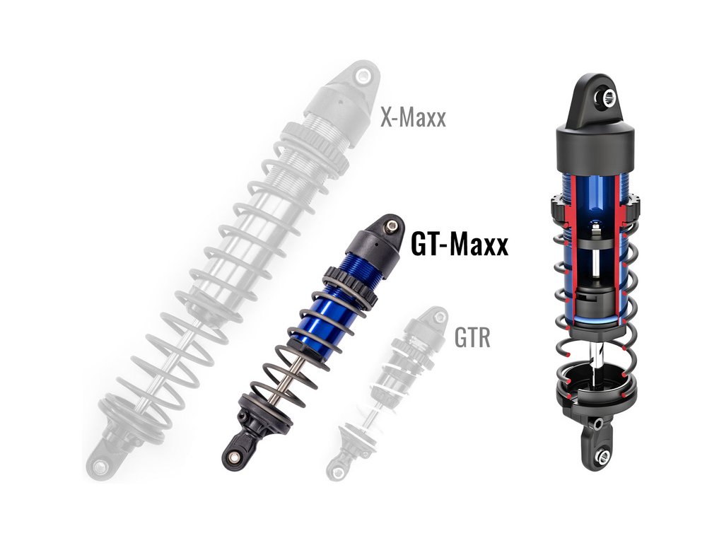 Čtyři mimořádně velké tlumiče GT-Maxx účinně absorbují i ty nejtvrdší dopady. Olejem plněné hliníkové tělo tlumičů je opatřeno závitem a maticí pro snadné nastavení předpětí pružin. Proti úniku oleje kolem pístnice je tlumič vybaven dvojitými X-kroužky.
