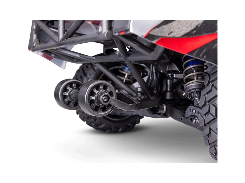 Model má brutální výkon, proto je vybaven zadními opěrnými kolečky, které umožňují jízdu po zadních kolech. Kolečka lze nastavit do nižší nebo vyšší pozice.