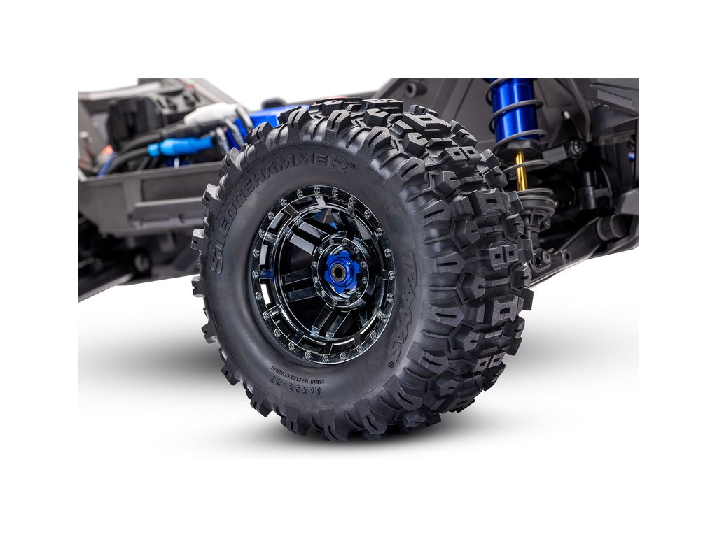 Obří pneumatiky Sledgehammer 5,6" se vyznačují agresivním dezénem s otevřenými bloky, které výborně odvádí nečistoty a zajišťují bezkonkurenční trakci. Černě chromovaná kola 2,8" využívají drážkovaný 17 mm šestihranný unašeč z hliníku.