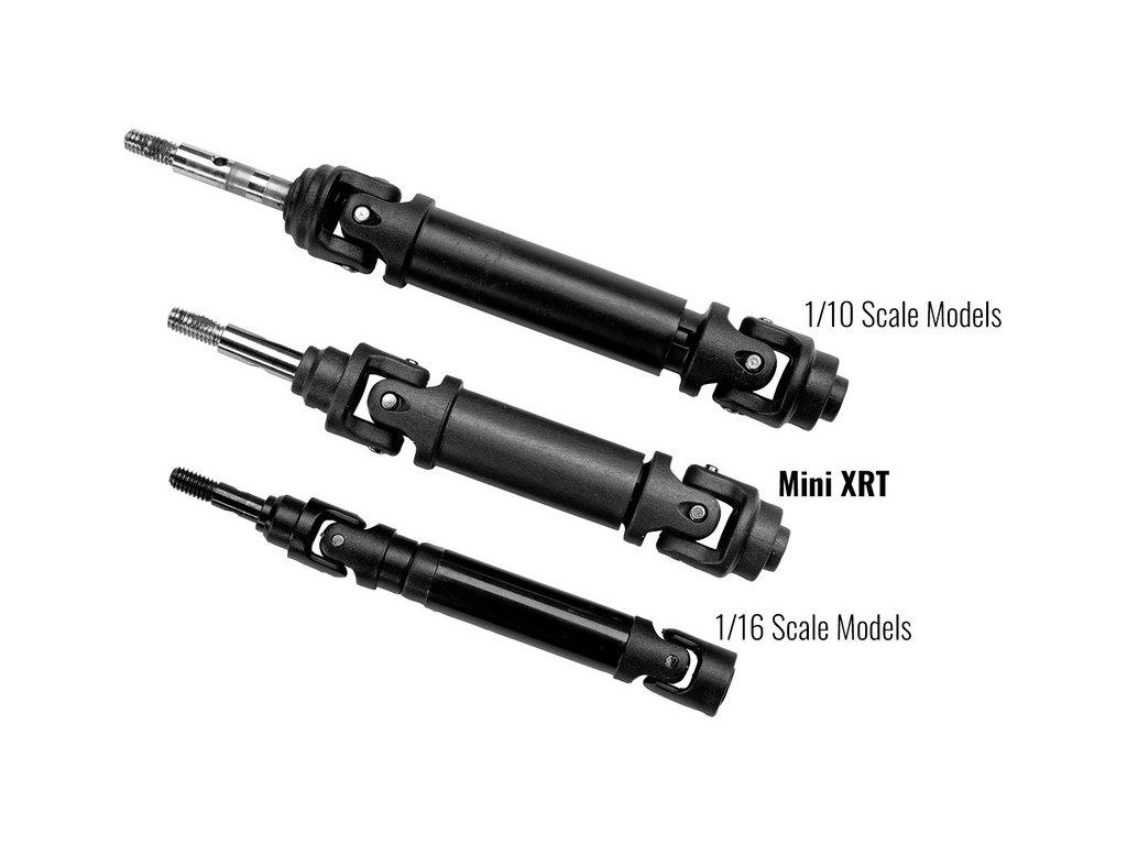 Hnací hřídele použité v RC modelu auta Mini XRT jsou o 50% větší než standardní na modelech 1:16. Kardanové klouby i teleskopická těla jsou zesílena pro rychlé starty a ostré brzdění.