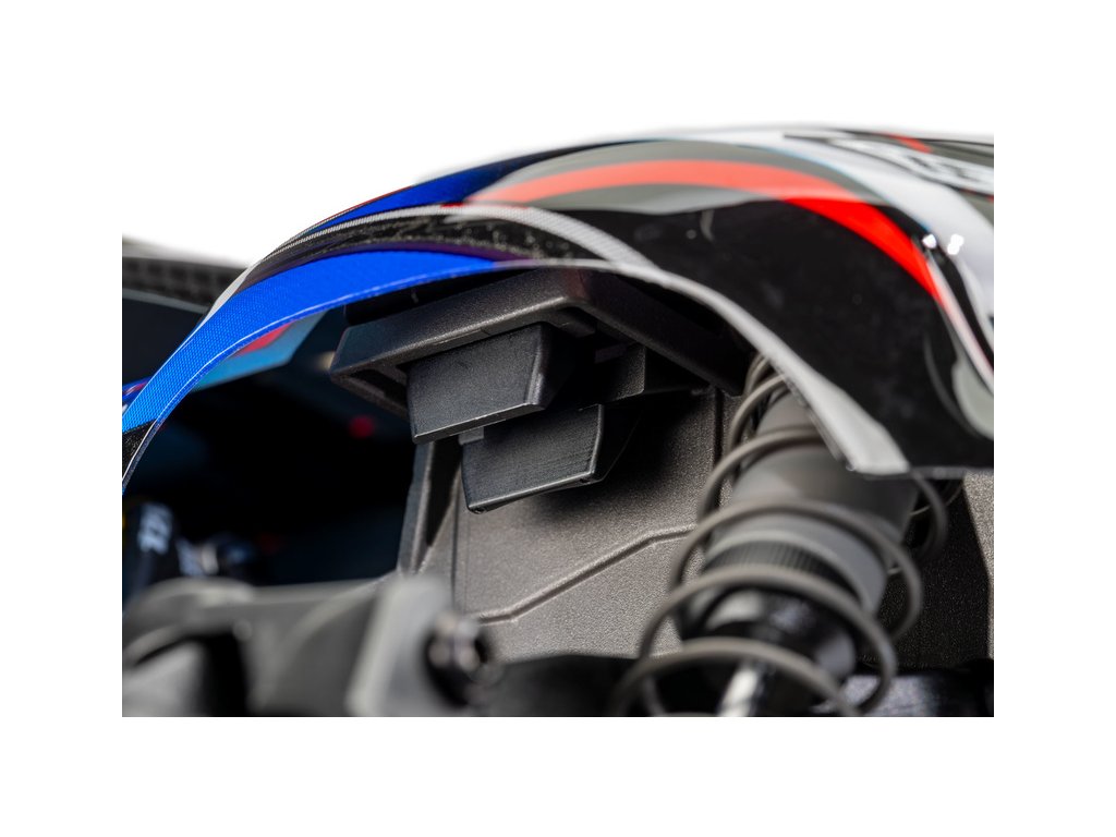 Karoserie pevně drží na místě díky držáku, který je součástí šasi RC modelu. I pokud se model ocitne v kotrmelcích, karoserie se z modelu neuvolní.