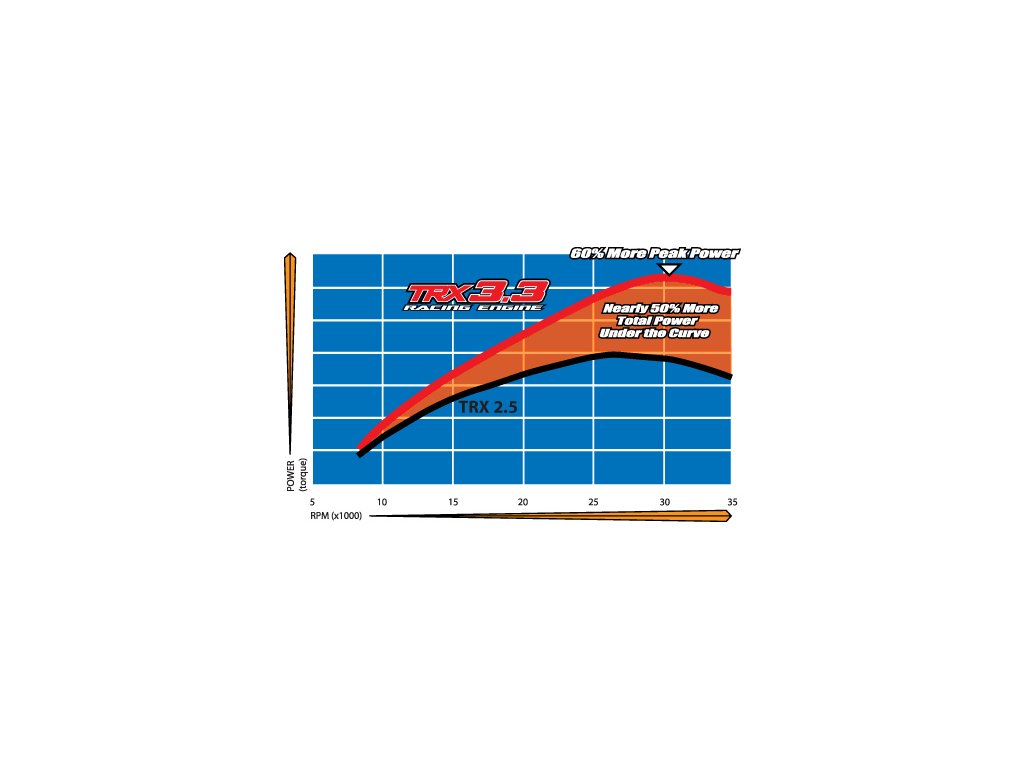 Traxxas 3.3 ve srovnání s motorem 2.5 dává o 60% více výkonu! Navíc výkonová křivka je o 50% hladší než u předchozí pohonné jednotky. Tím je TRX 3.3 vrcholem extrémního výkonu a spolehlivosti.