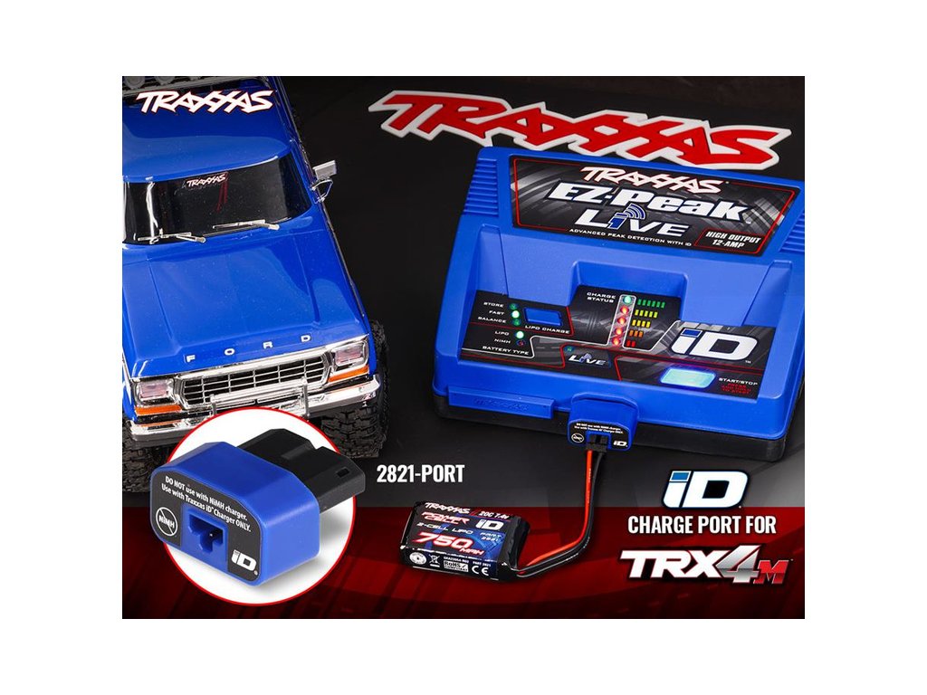 - Port umožňuje připojit baterii z modelů TRX-4M k univerzálním nabíječům Traxxas EZ-Peak ID