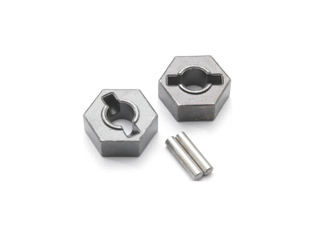 Unašeče disků kol s čepy. Unašeč šestihran 14 mm, tloušťka unašeče 5,5 mm, otvor pro hřídel o průměru 6 mm. Čepy průměr 2,5 mm, délka 12,5 mm. Unašeče jsou vyrobeny z oceli.
