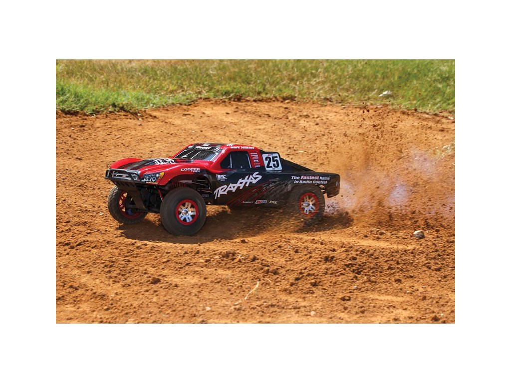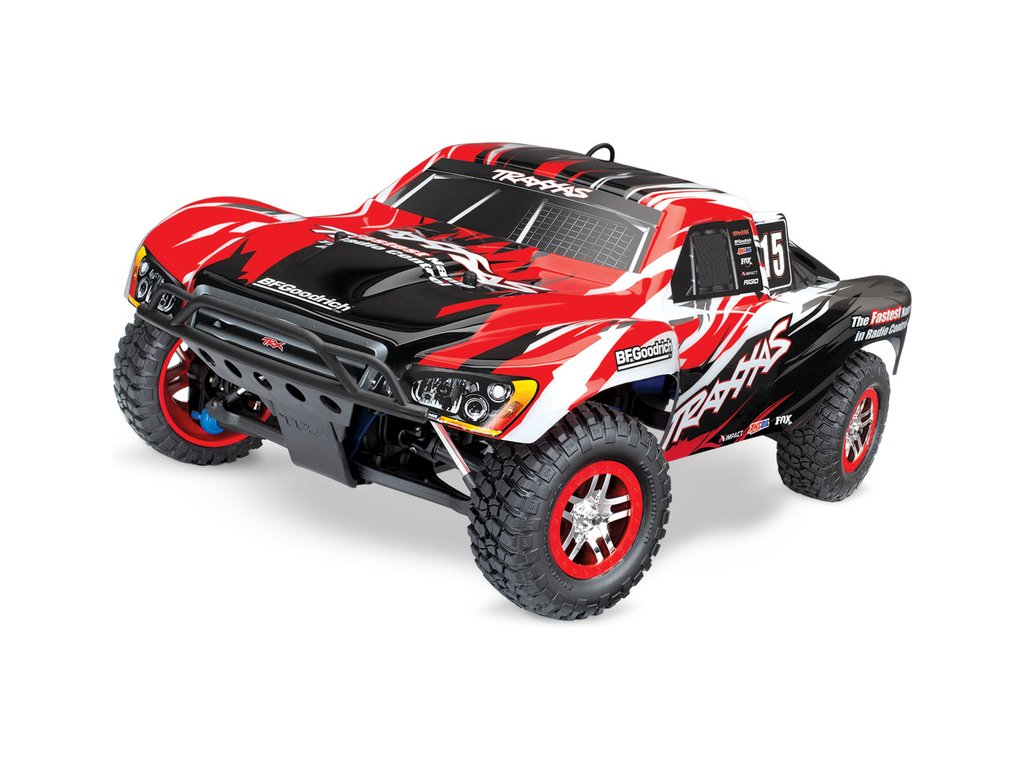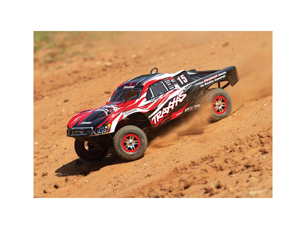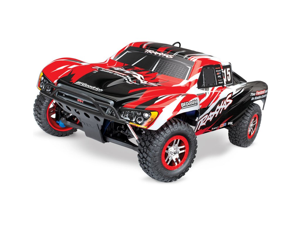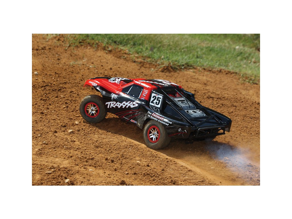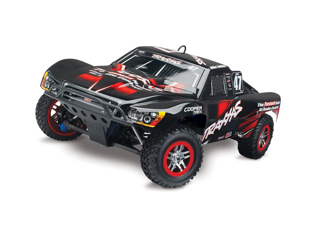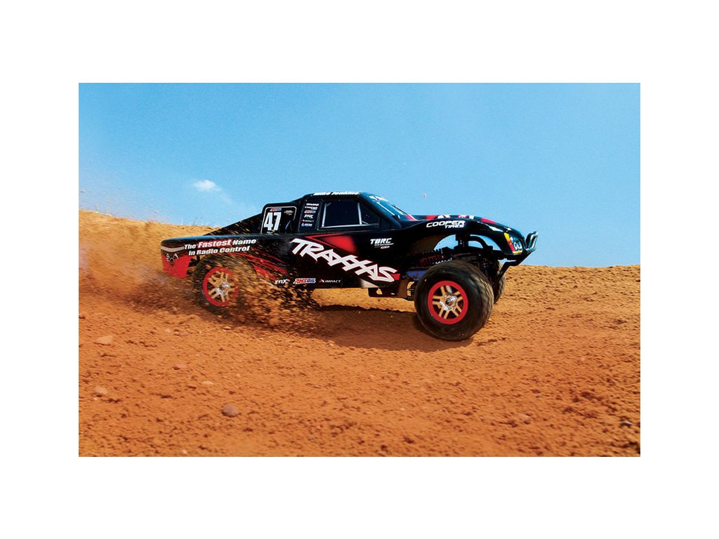 RC model auta Racing Short Course Truck Slayer Pro 4x4 je špičkový nástroj k vítězství. Je poháněn výkonným závodním motorem TRX 3.3 s laděným výfukem, tuhý podvozek je ze 3 mm silného 6061-T6 modře eloxovaného hliníku. Terénní pneumatiky poskytují maximální přilnavost v terénu. RC auto Traxxas Slayer má velkou světlou výšku, která mu nebrání projíždět i ty největší nerovnosti. Slayer Pro má neuvěřitelné zrychlení a skvělé vedení na trati i díky náhonu 4WD a velkému rozvoru. Dosahuje rychlosti až 80 km/hod!