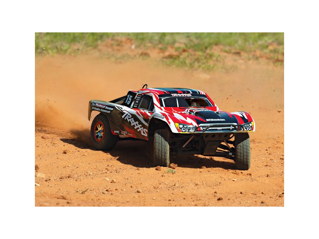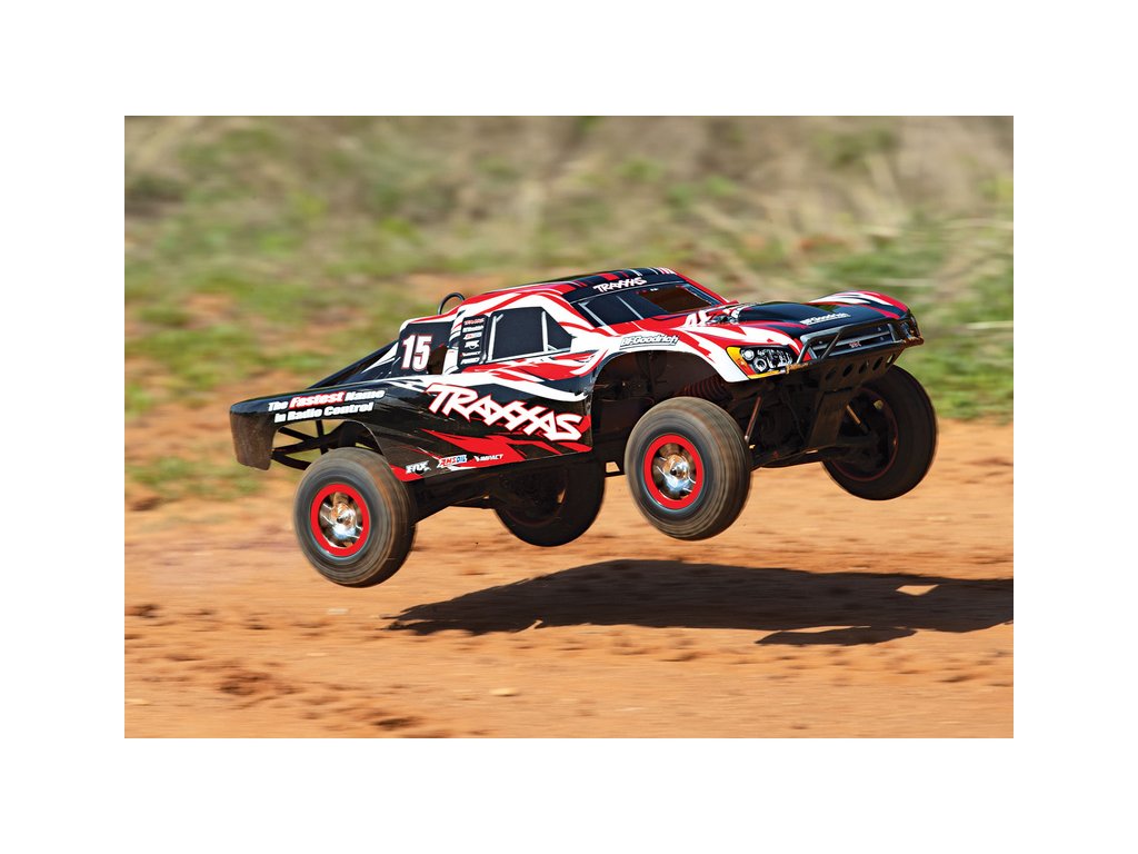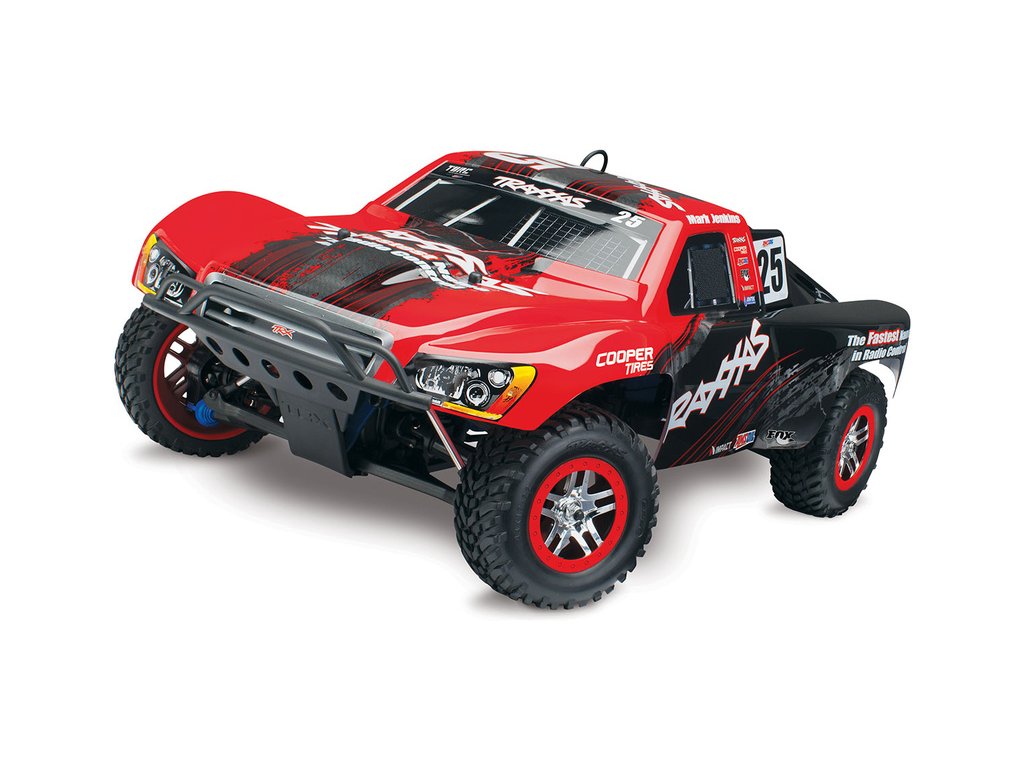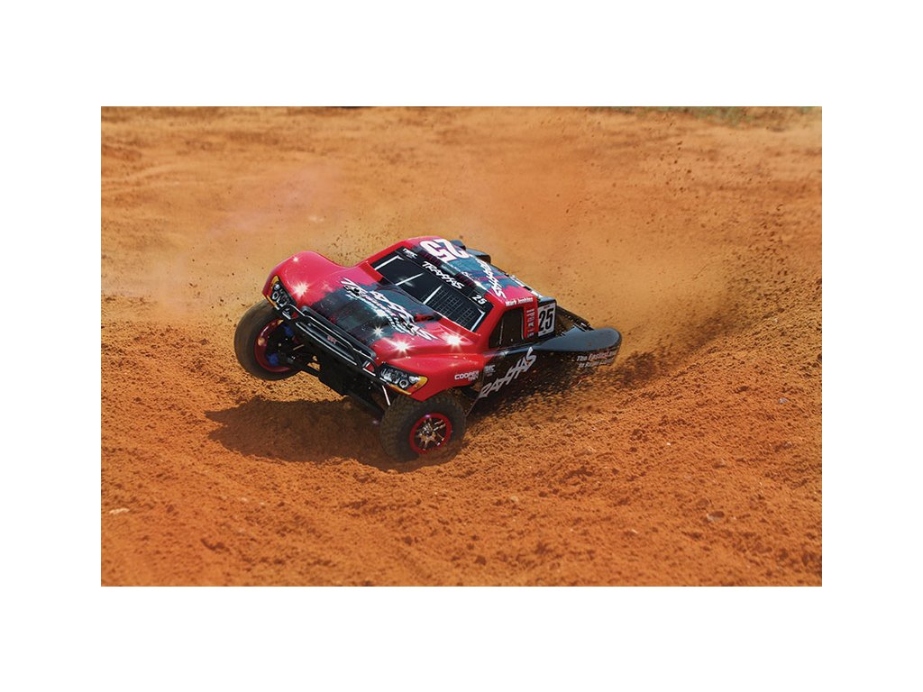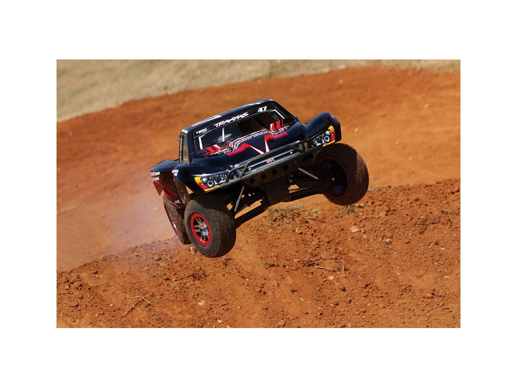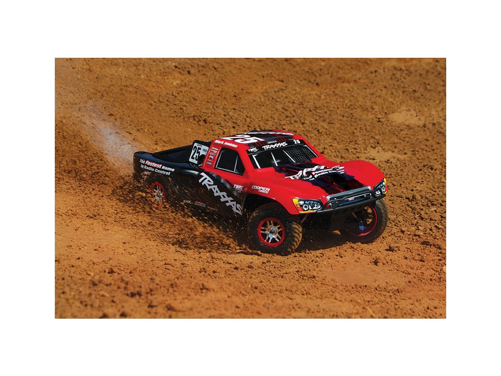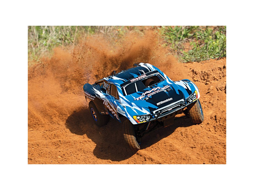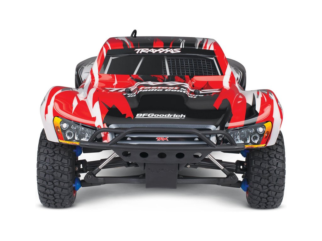 RC model auta Racing Short Course Truck Slayer Pro 4x4 je špičkový nástroj k vítězství. Je poháněn výkonným závodním motorem TRX 3.3 s laděným výfukem, tuhý podvozek je ze 3 mm silného 6061-T6 modře eloxovaného hliníku. Terénní pneumatiky poskytují maximální přilnavost v terénu. RC auto Traxxas Slayer má velkou světlou výšku, která mu nebrání projíždět i ty největší nerovnosti. Slayer Pro má neuvěřitelné zrychlení a skvělé vedení na trati i díky náhonu 4WD a velkému rozvoru. Dosahuje rychlosti až 80 km/hod!