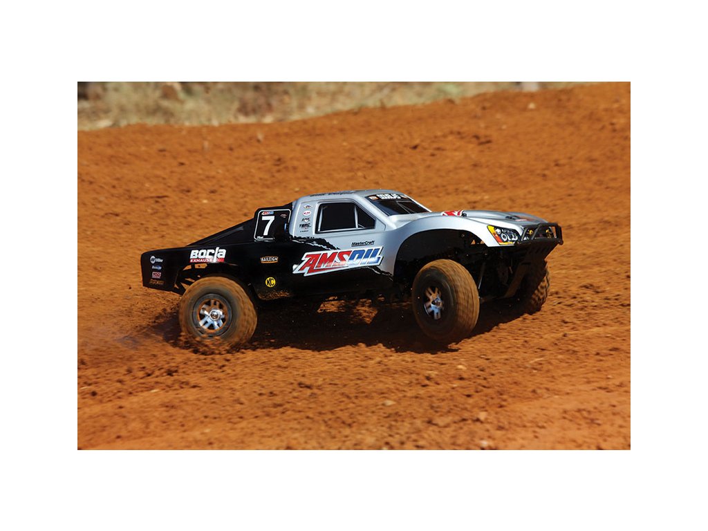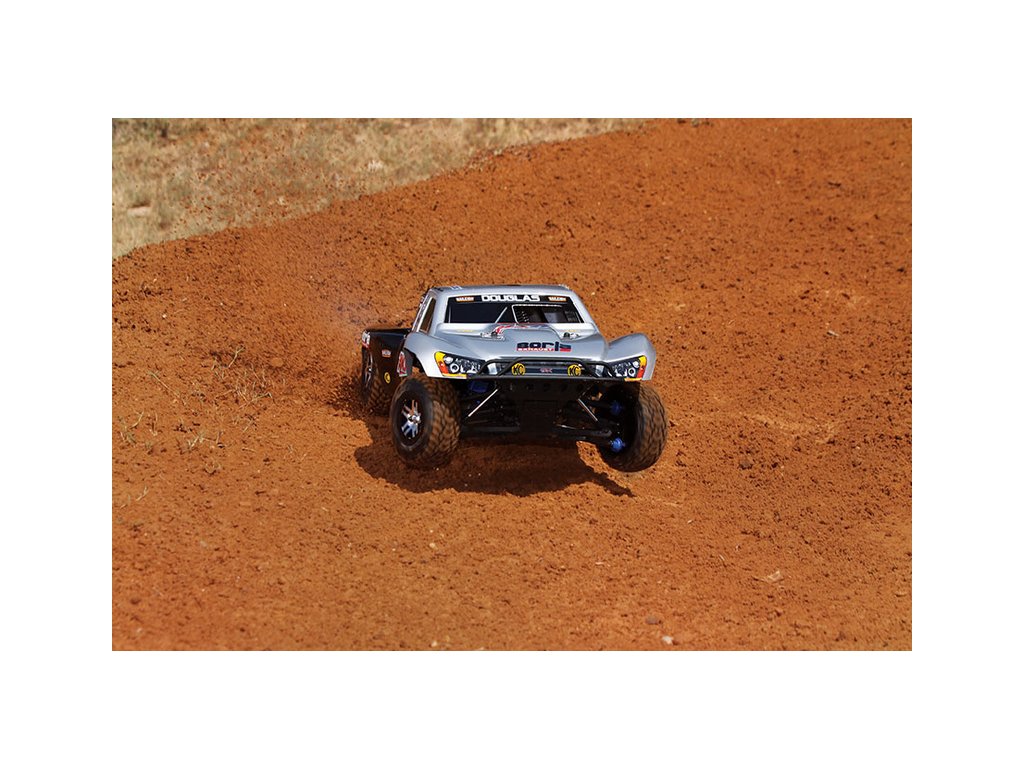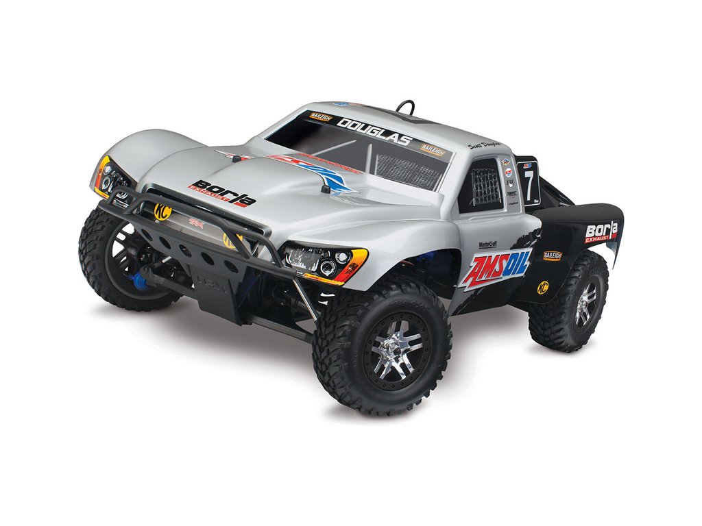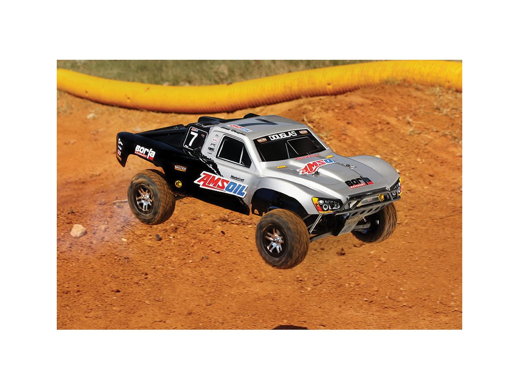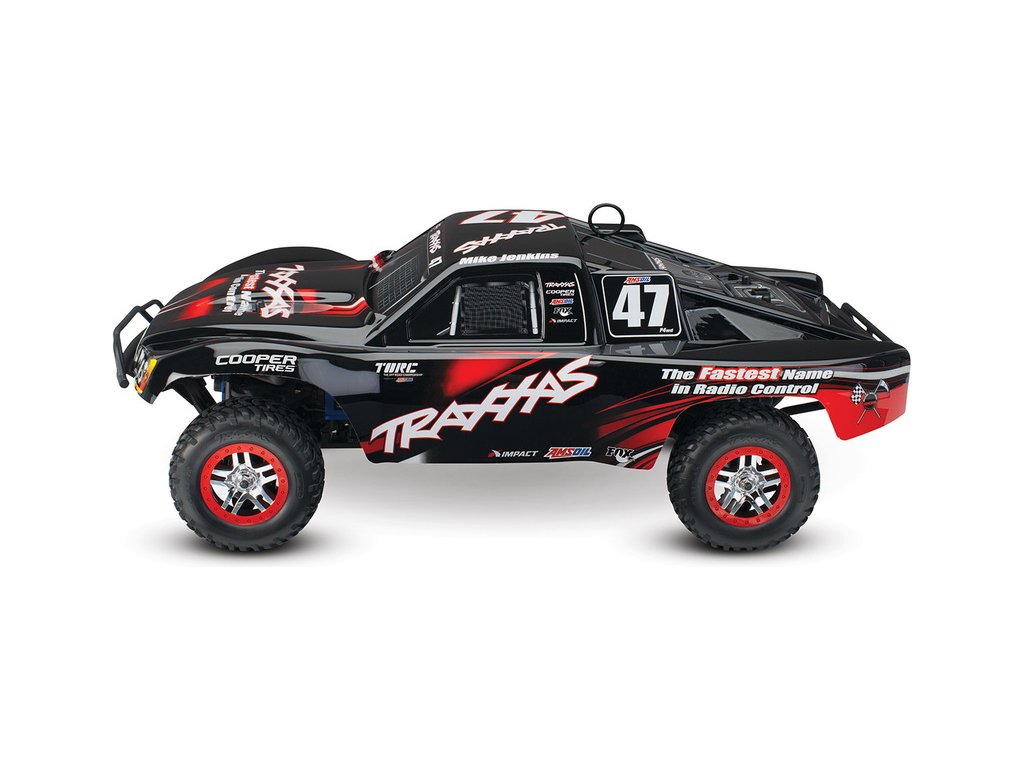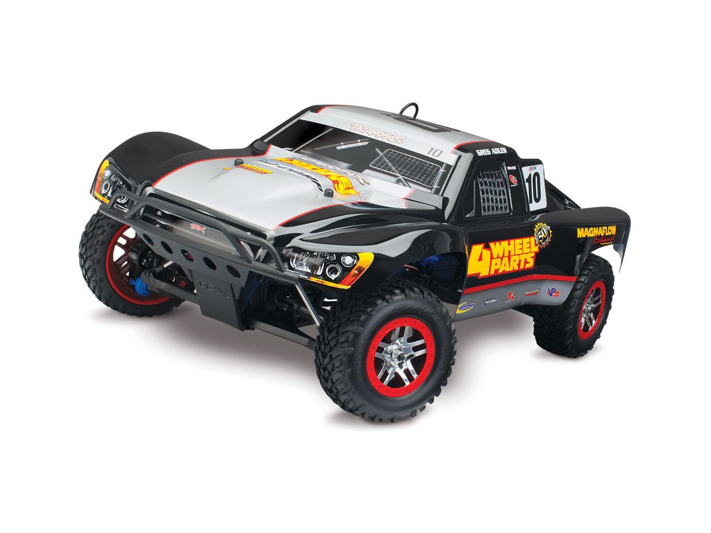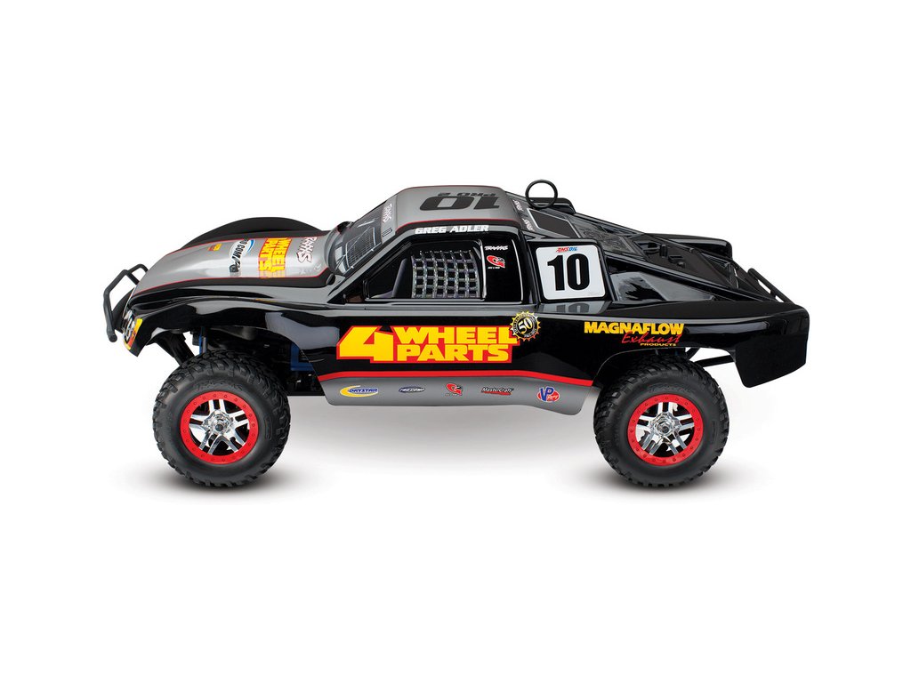 RC model auta Racing Short Course Truck Slayer Pro 4x4 je špičkový nástroj k vítězství. Je poháněn výkonným závodním motorem TRX 3.3 s laděným výfukem, tuhý podvozek je ze 3 mm silného 6061-T6 modře eloxovaného hliníku. Terénní pneumatiky poskytují maximální přilnavost v terénu. RC auto Traxxas Slayer má velkou světlou výšku, která mu nebrání projíždět i ty největší nerovnosti. Slayer Pro má neuvěřitelné zrychlení a skvělé vedení na trati i díky náhonu 4WD a velkému rozvoru. Dosahuje rychlosti až 80 km/hod!