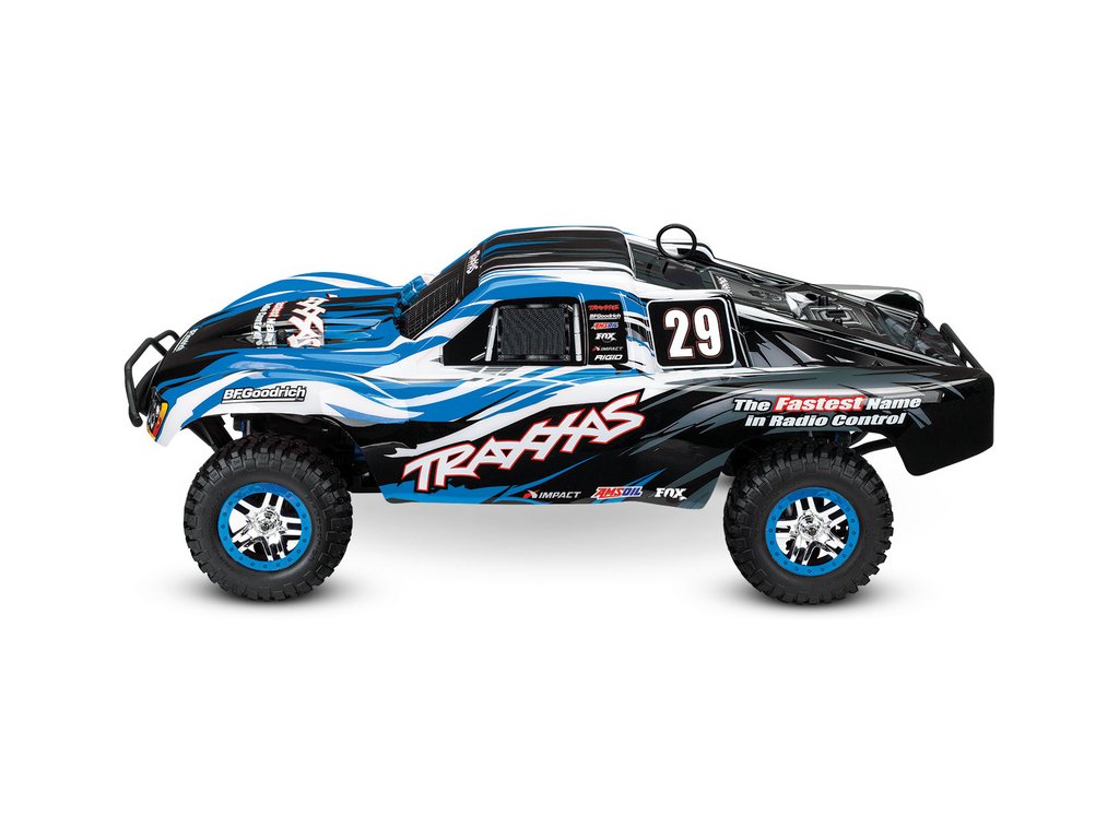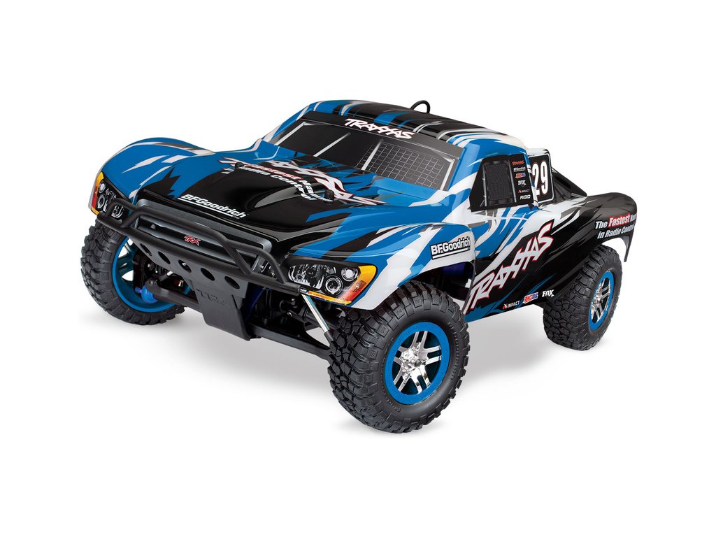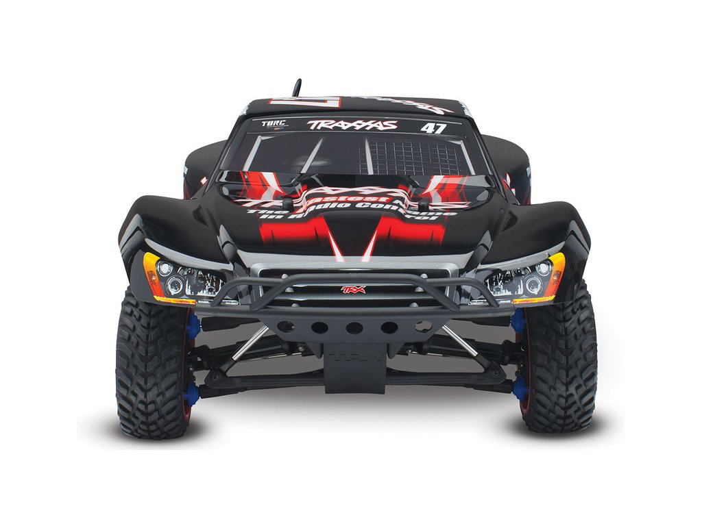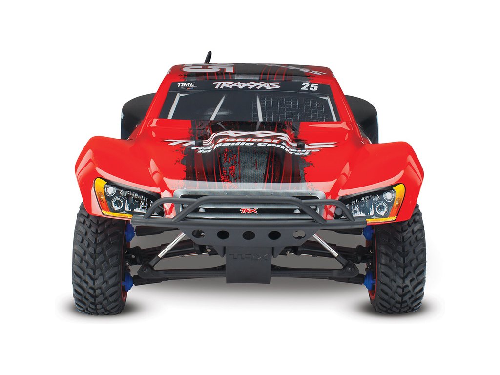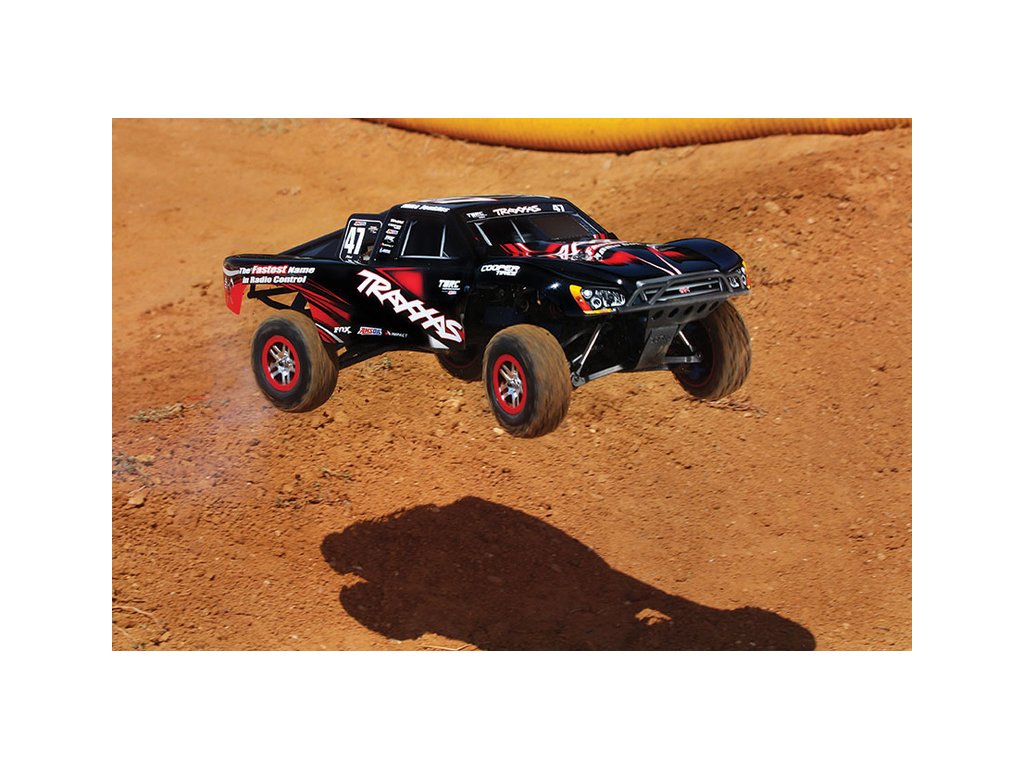 RC model auta Racing Short Course Truck Slayer Pro 4x4 je špičkový nástroj k vítězství. Je poháněn výkonným závodním motorem TRX 3.3 s laděným výfukem, tuhý podvozek je ze 3 mm silného 6061-T6 modře eloxovaného hliníku. Terénní pneumatiky poskytují maximální přilnavost v terénu. RC auto Traxxas Slayer má velkou světlou výšku, která mu nebrání projíždět i ty největší nerovnosti. Slayer Pro má neuvěřitelné zrychlení a skvělé vedení na trati i díky náhonu 4WD a velkému rozvoru. Dosahuje rychlosti až 80 km/hod!