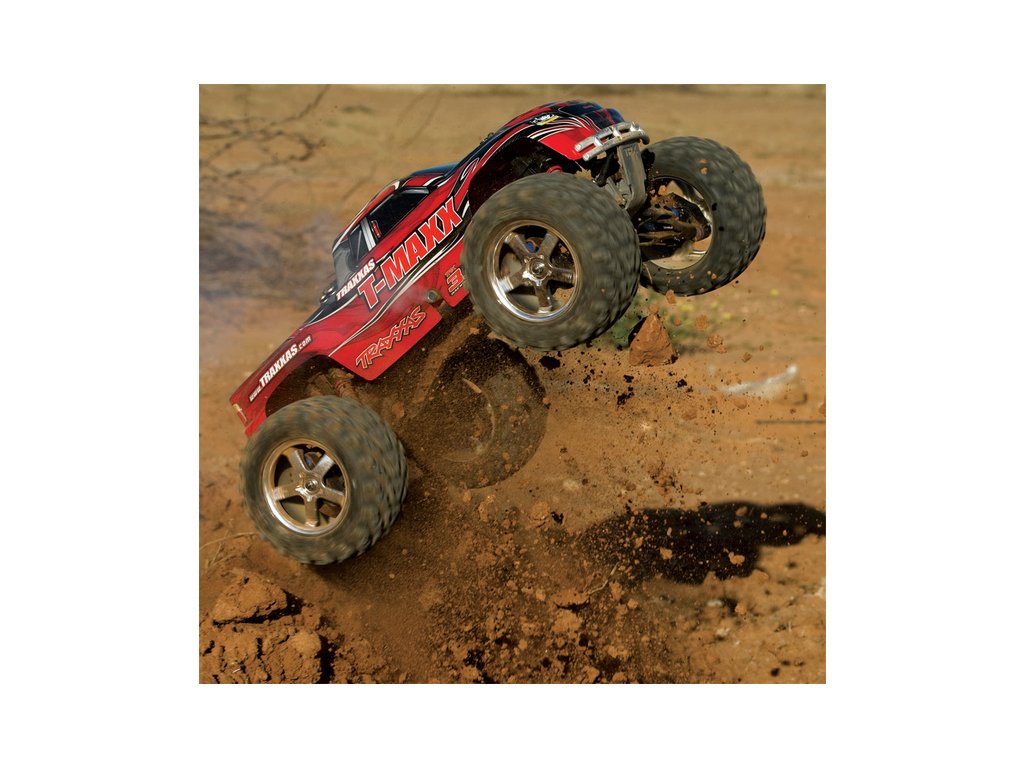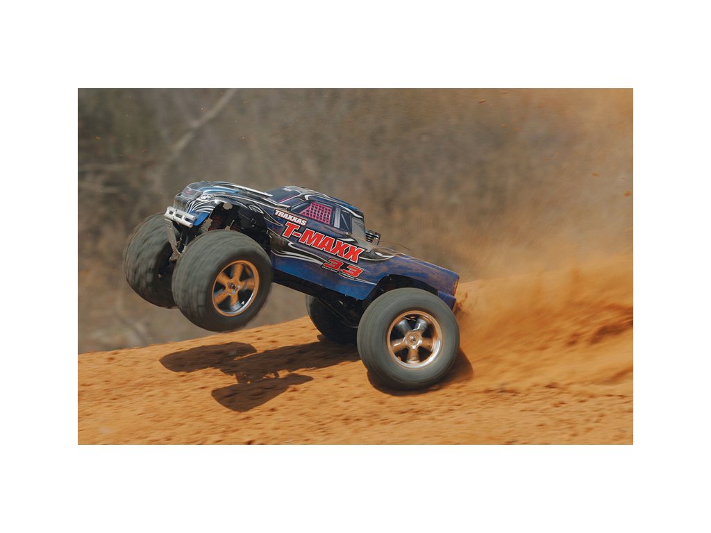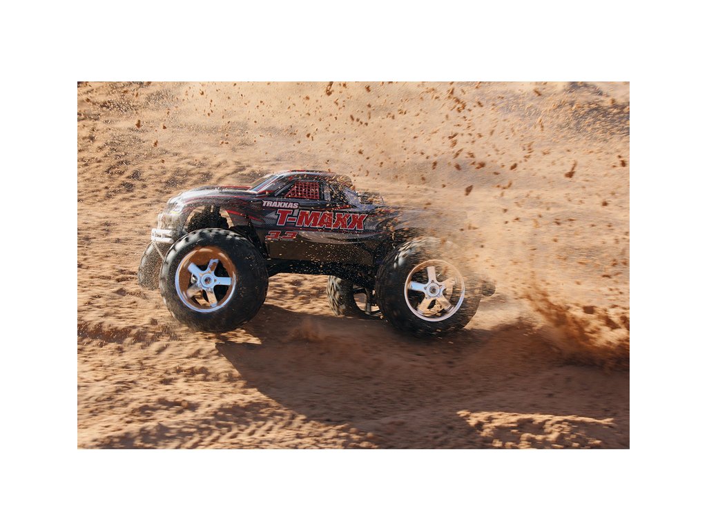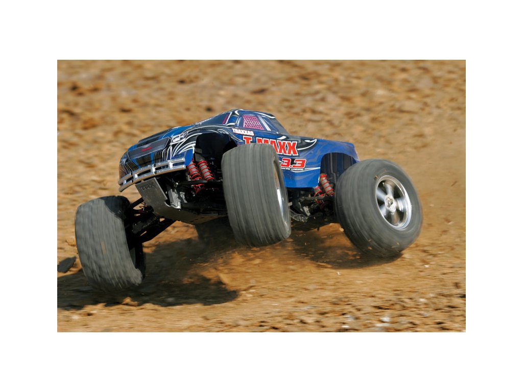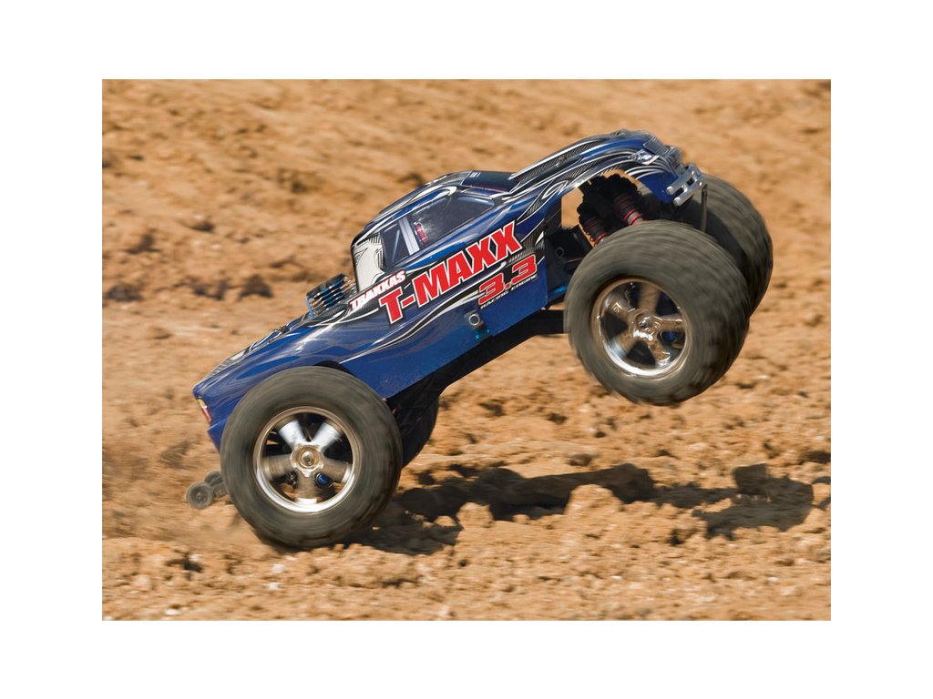 RC model auta Traxxas Nitro T-Maxx 3.3 4WD je výkonný monster truck se spalovacím závodním nitro motorem TRX 3.3 s laděným výfukem a automatickou dvoustupňovou převodovkou. RC souprava Traxxas TQi s Bluetooth modulem, telemetrií a stabilizací TSM. Rychlost až 72 km/h.