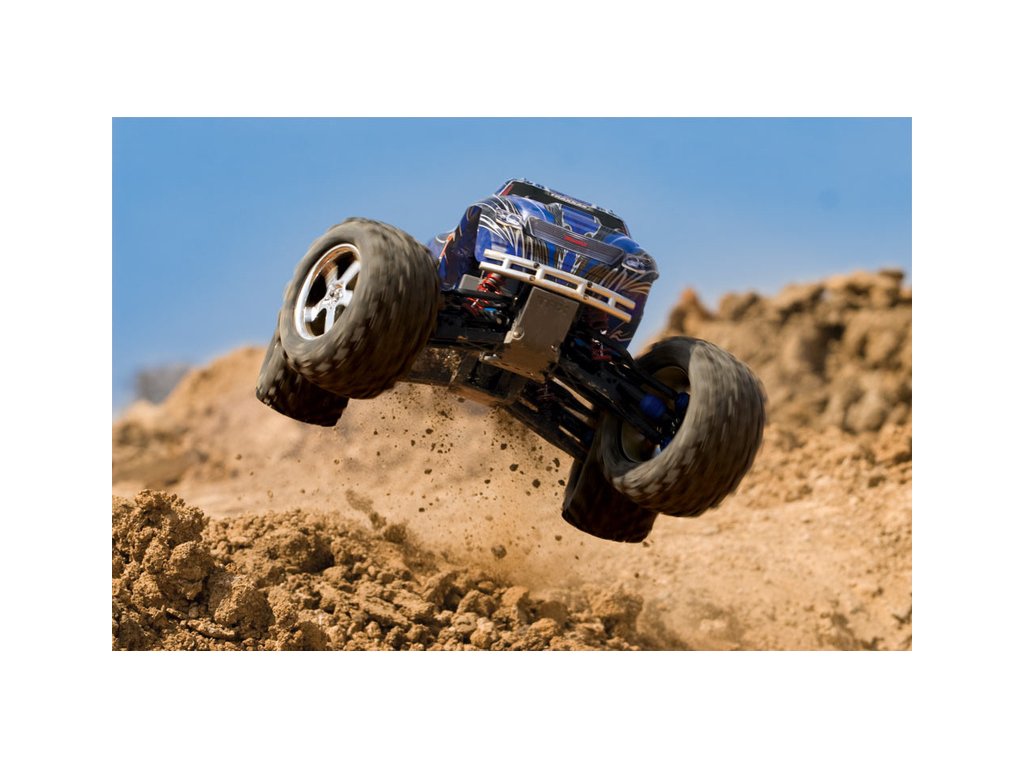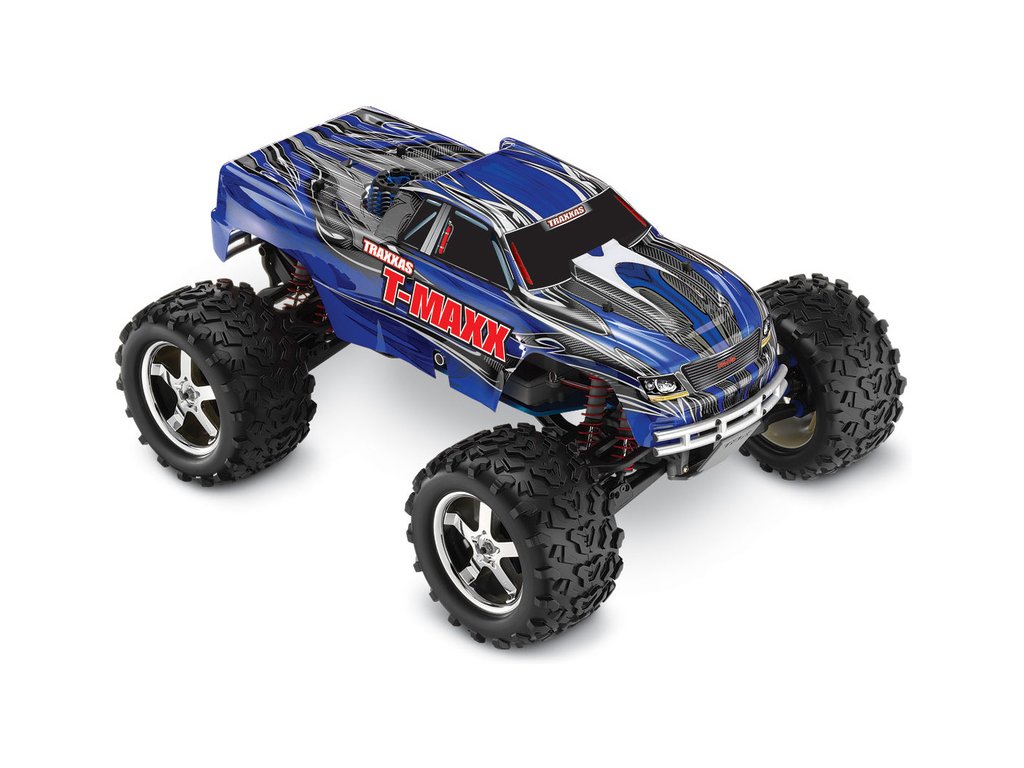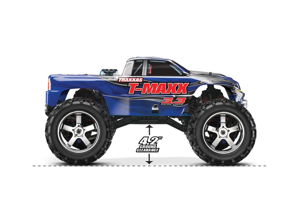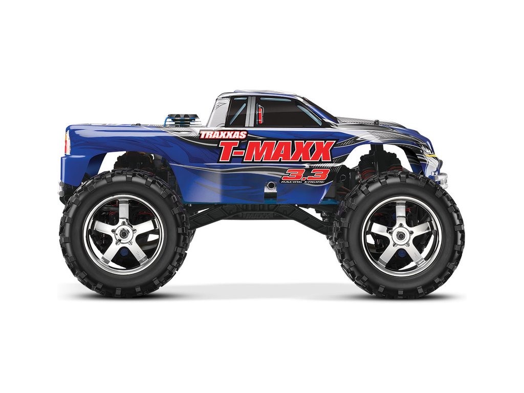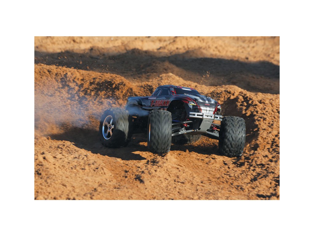 RC model auta Traxxas Nitro T-Maxx 3.3 4WD je výkonný monster truck se spalovacím závodním nitro motorem TRX 3.3 s laděným výfukem a automatickou dvoustupňovou převodovkou. RC souprava Traxxas TQi s Bluetooth modulem, telemetrií a stabilizací TSM. Rychlost až 72 km/h.