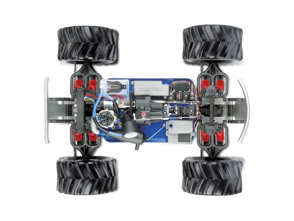 RC model auta Traxxas Nitro T-Maxx Classic v měřítku 1:8 s 3-kanálovým vysílačem TQ. Závodní nitor motor TRX 2.5 s laděným výfukem, tuhý podvozek ze 3.2 mm 6061-T6 modře eloxovaného hliníku. Elektrický startér. 2-stupňová převodovka se zpátečkou. Rychlost až 64 km/h.