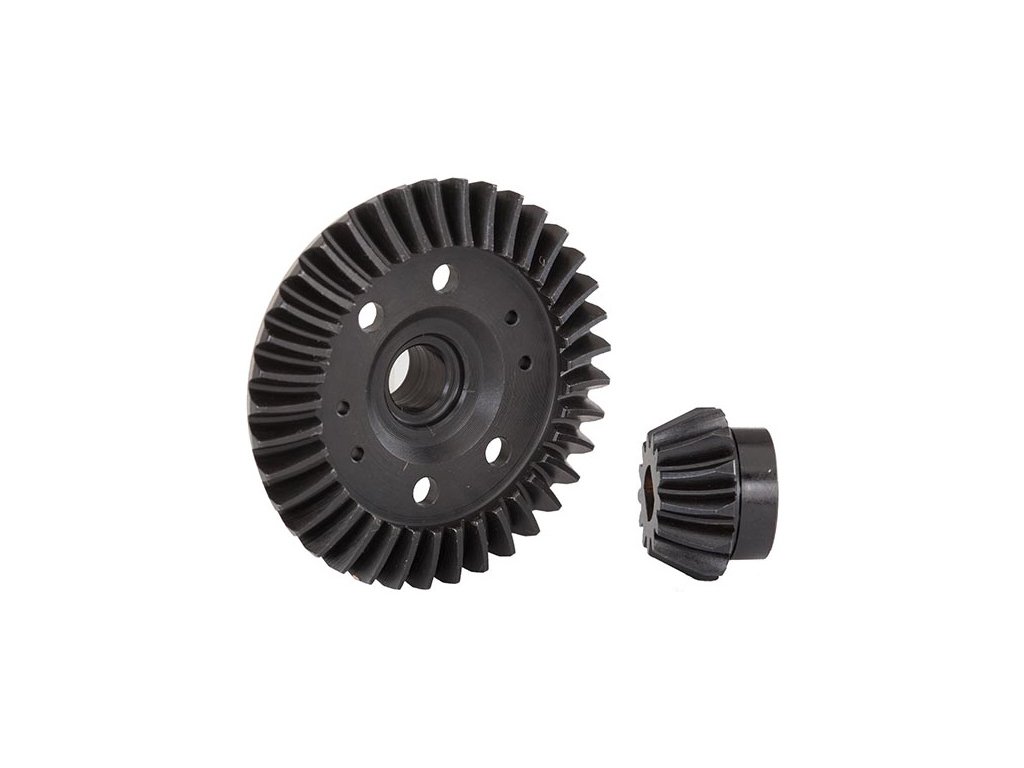 Kalená CNC obráběná ozubená kola náhonu zadního diferenciálu se spirálovým tvarem ozubením. Spirálové ozubení přináší tiší chod a plynulý přenos momentu. Tunigová varianta k položce TRA6879.