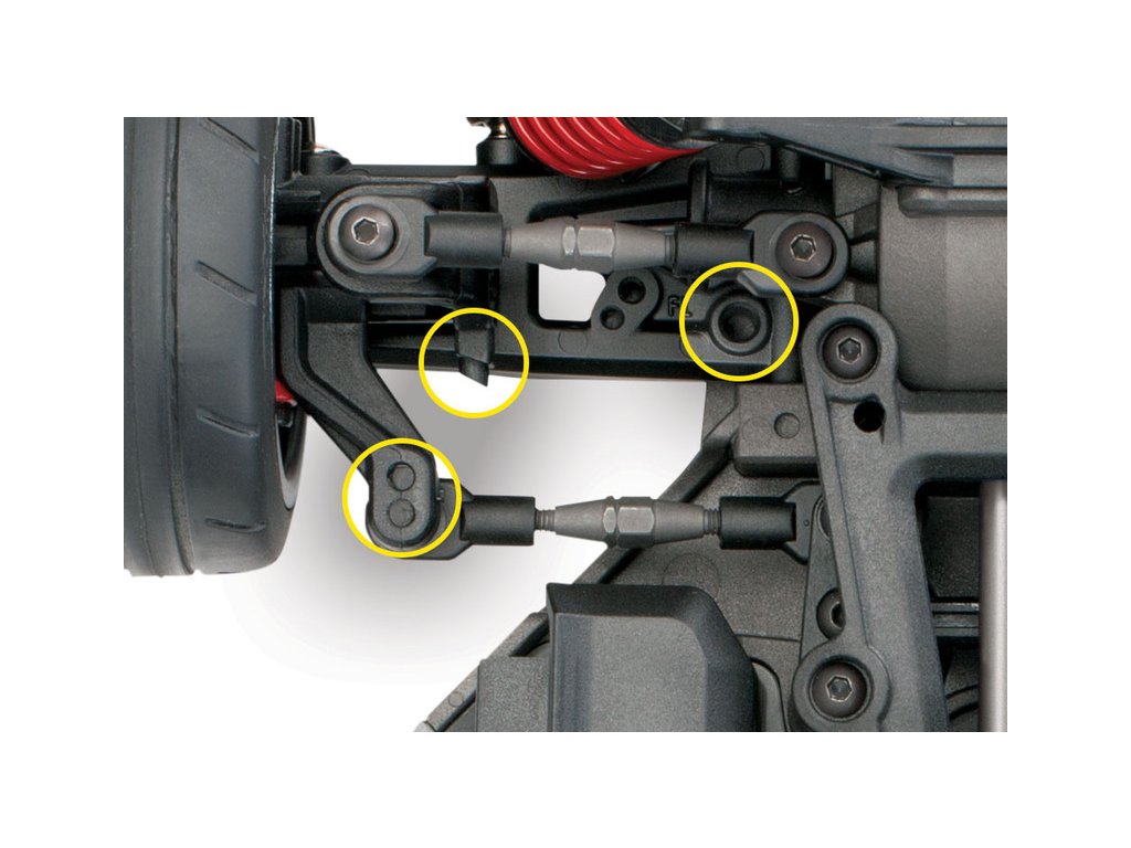 Dále zavěšení obsahuje omezitelný vertikální pohyb ramen. Pomocí stavěcího šroubu M4 můžete omezit vertikální pohyb ramene. To vám umožní rychleji projíždět zatáčky a zlepšuje jízdní vlastnosti při driftování.