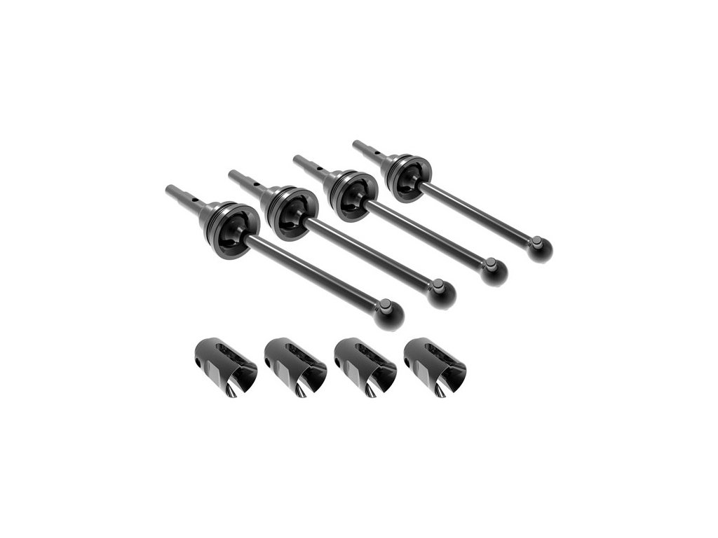 Tuningový díl pro RC modely aut Traxxas Mini Maxx: sada ocelových poloos CVD. Balení obsahuje poloosy přední nebo zadní (4), podkovičky diferenciálů (4), čepy (4).